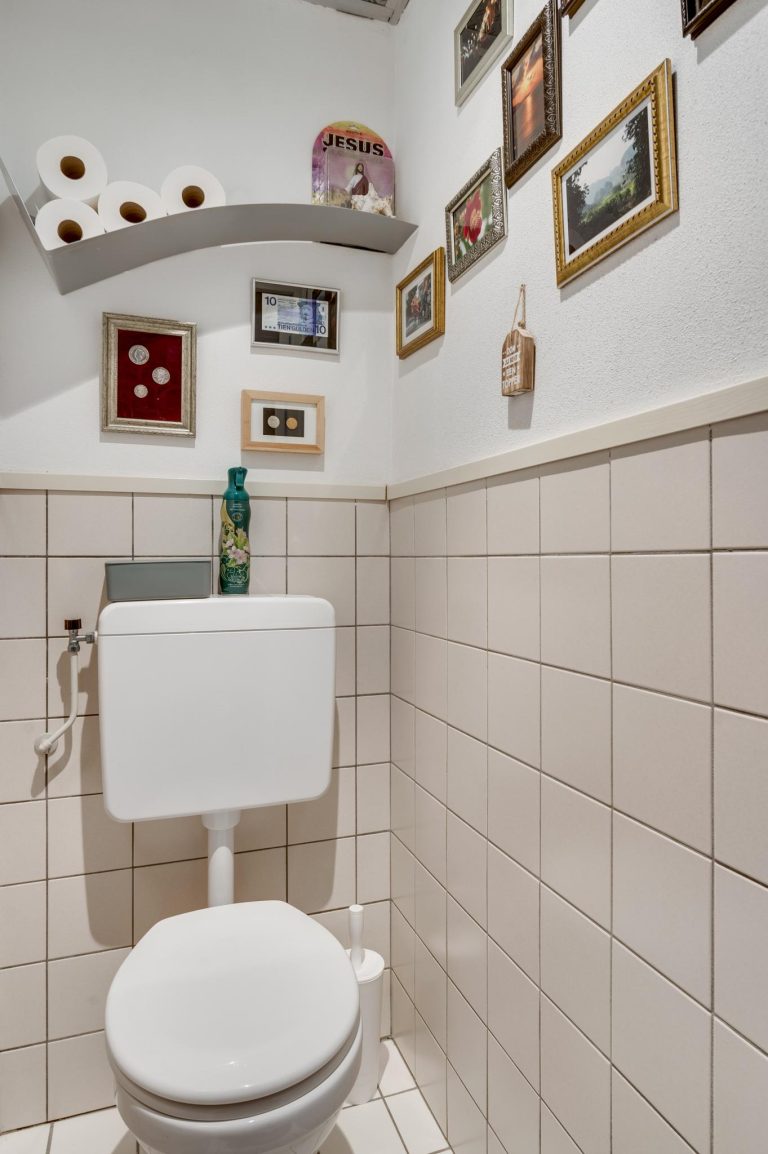 Hal met laminaatvloer, welke doorloopt in de woonkamer. Bergruimte met mechanische afzuiging en meterkast. Halfhoog betegeld toiletruimte met staand toilet.