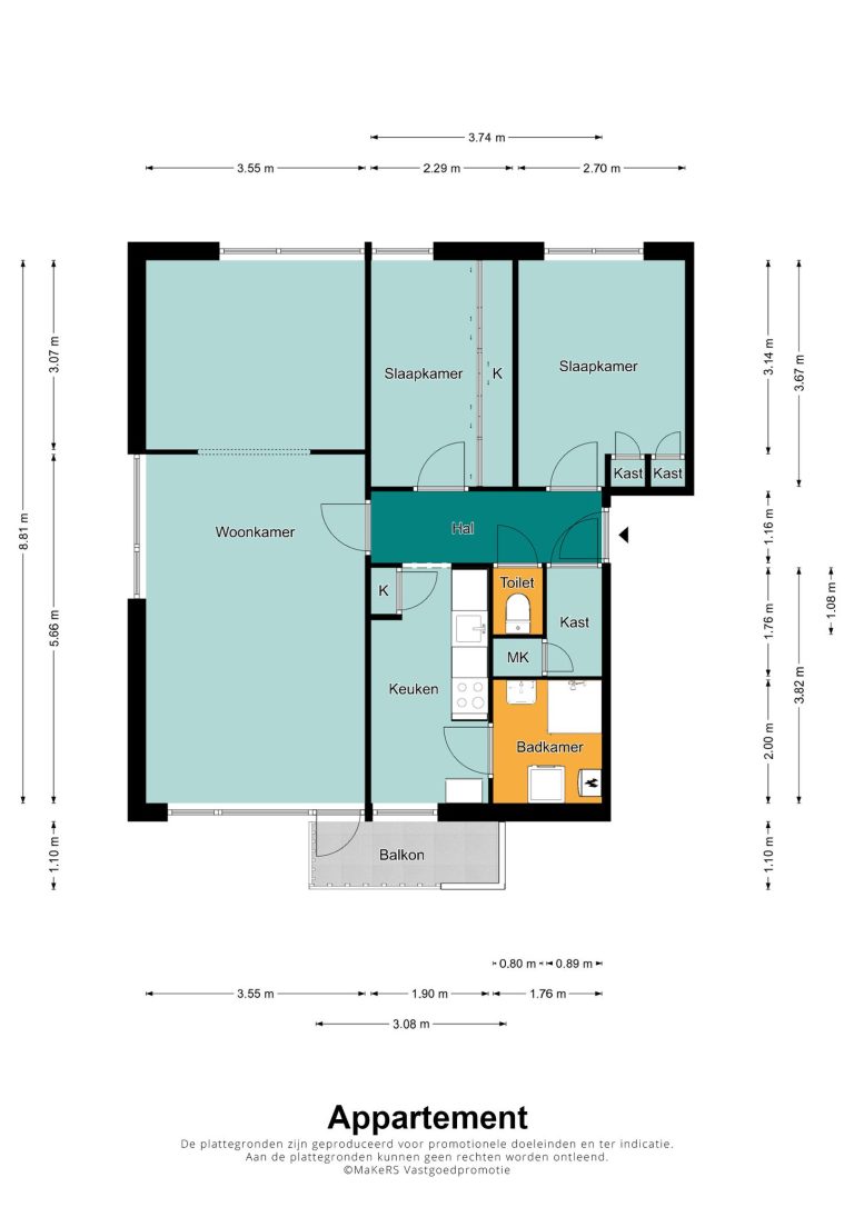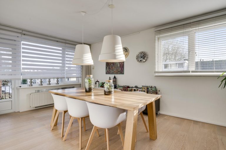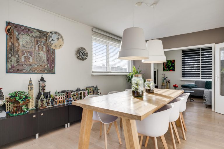 De heerlijk lichte woonkamer, groot ca. 8,8 bij 3,55m, heeft veel lichtinval door de grote raampartijen aan voor- en achterzijde. De hoekligging van het appartement heeft als voordeel een extra raam in de zijgevel waardoor de middagzon in de woonkamer binnen komt. Vanuit woonkamer bereikbaar balkon aan de voorzijde.