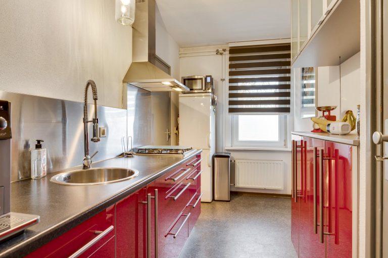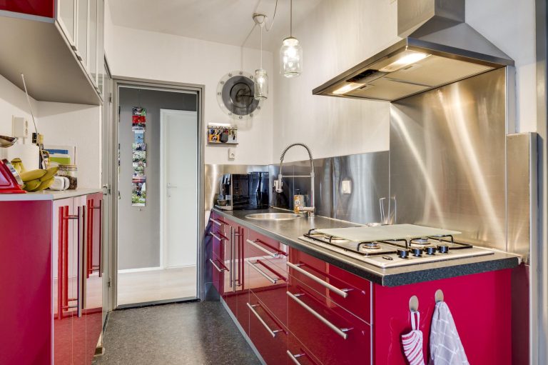 Gesloten keuken met keukenopstand voorzien van gaskookplaat en afzuigkap (recirculatie), kunststof werkblad en vloer voorzien van zeil. Vanuit de keuken toegang tot de betegelde badkamer met hoekdouche, vaste wastafel, opstelling Remeha cv-combiketel 2017 en aansluiting wasmachine.