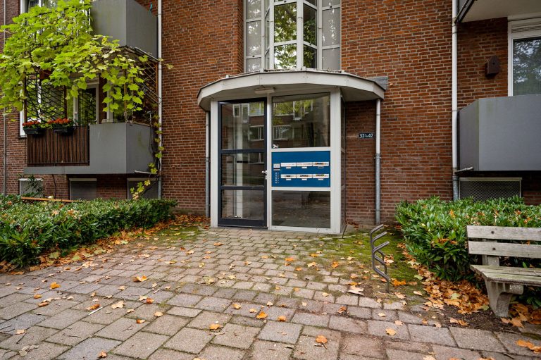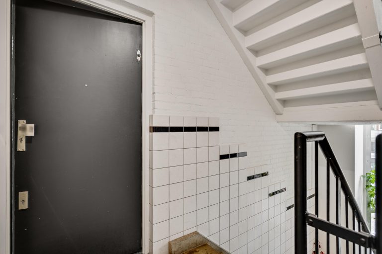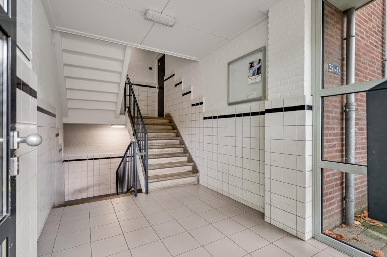 Centrale entree met bellentableau en brievenbussen. Via het trappenhuis zijn zowel het souterrain als het appartement op de tweede verdieping bereikbaar.