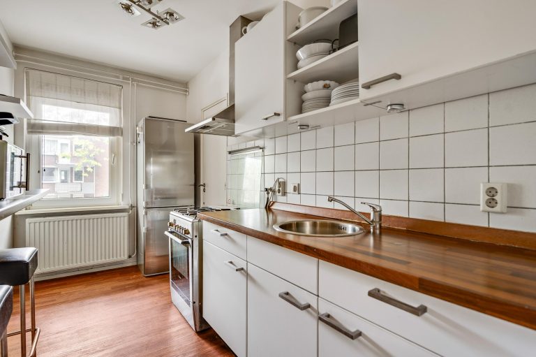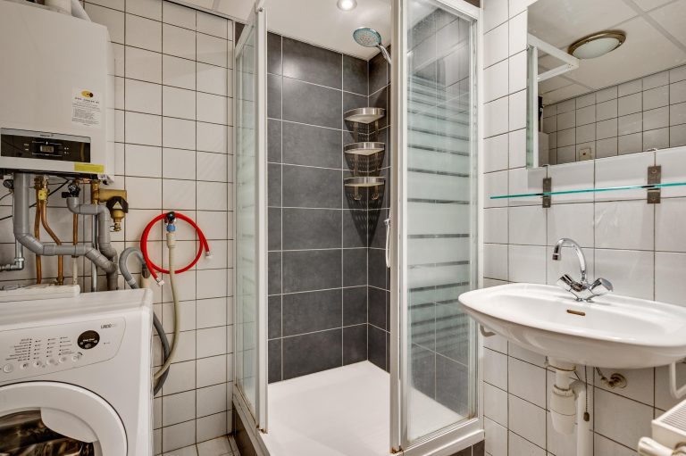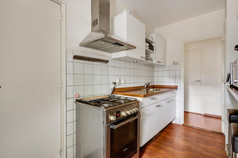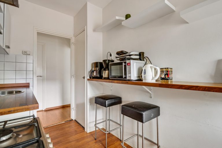 De gesloten keuken beschikt over een muurkast en een keukenblok met losse apparatuur. Aansluitend bevindt zich de geheel betegelde badkamer met douche, vaste wastafel en aansluiting voor witgoed.