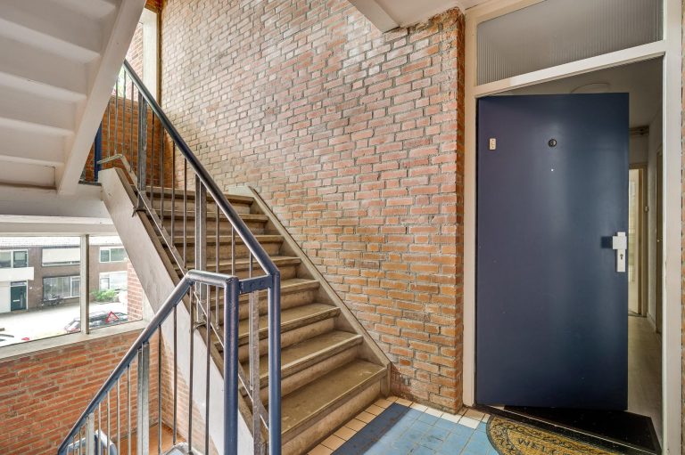 Centrale ontvangsthal met brievenbussen en bellentableau en trapopgang naar het appartement.