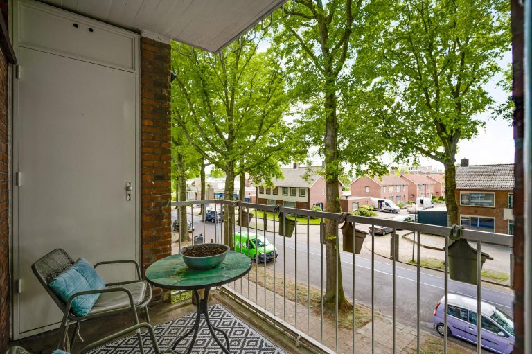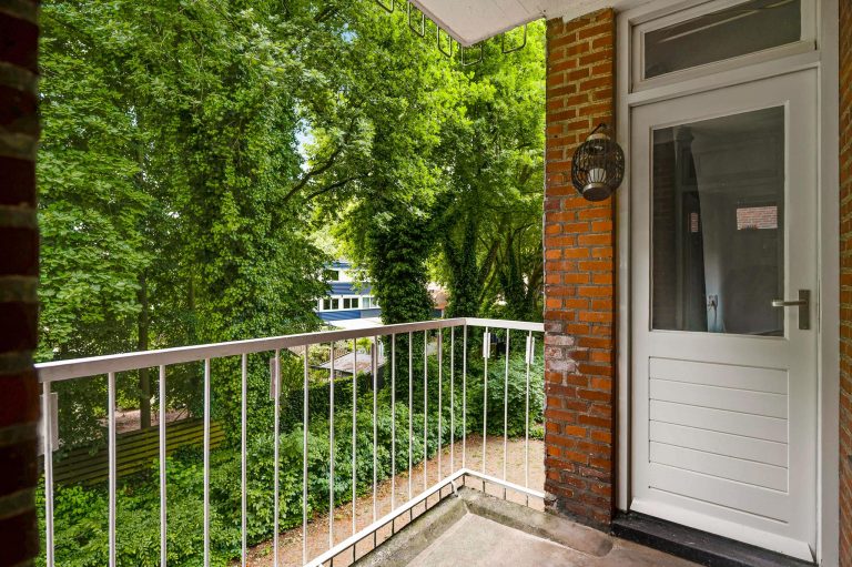 Het balkon aan de voorzijde, bereikbaar via de woonkamer en de keuken, beschikt over een handige berging met opstelling van de nieuwe CV installatie (Intergas 2024).