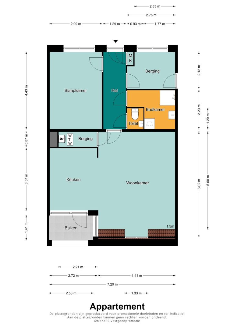 Het appartement bestaat uit een woonkamer met open keuken, balkon (loggia), 2 slaapkamers, badkamer en separate toiletruimte.