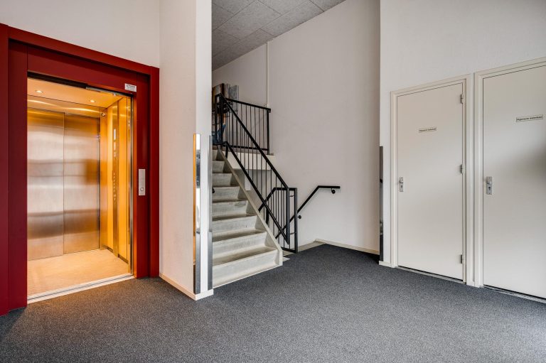 Centrale entree gelegen aan de voorzijde van het complex, met bellentableau voorzien van intercom met videofoon, brievenbussen en aansluitende de centrale hal met lift en trappenhuis naar verdieping en parkeerkelder.