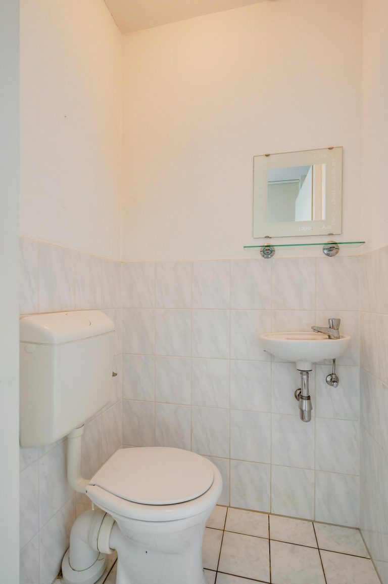 De separate toiletruimte is deels betegeld en voorzien van staand toilet met fonteintje.