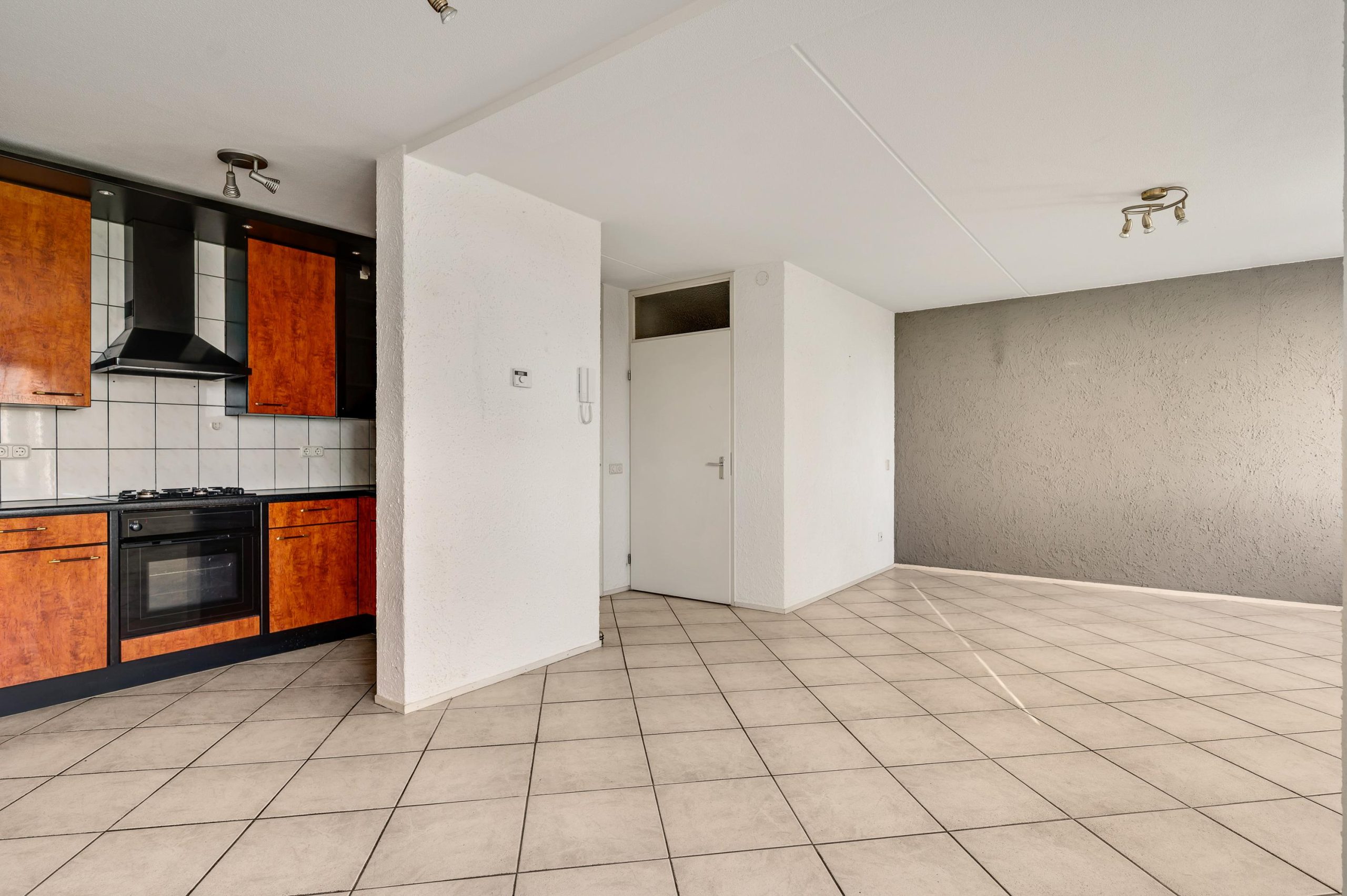 De ruime woonkamer met tegelvloer is licht en biedt uitzicht over het St. Rochusplein. De open keuken is voorzien van inbouwapparatuur zoals een gasfornuis, oven, koelkast en recirculatie-afzuigkap. Verder beschikt het appartement over een praktische berging met de cv-installatie en aansluiting voor de wasmachine.