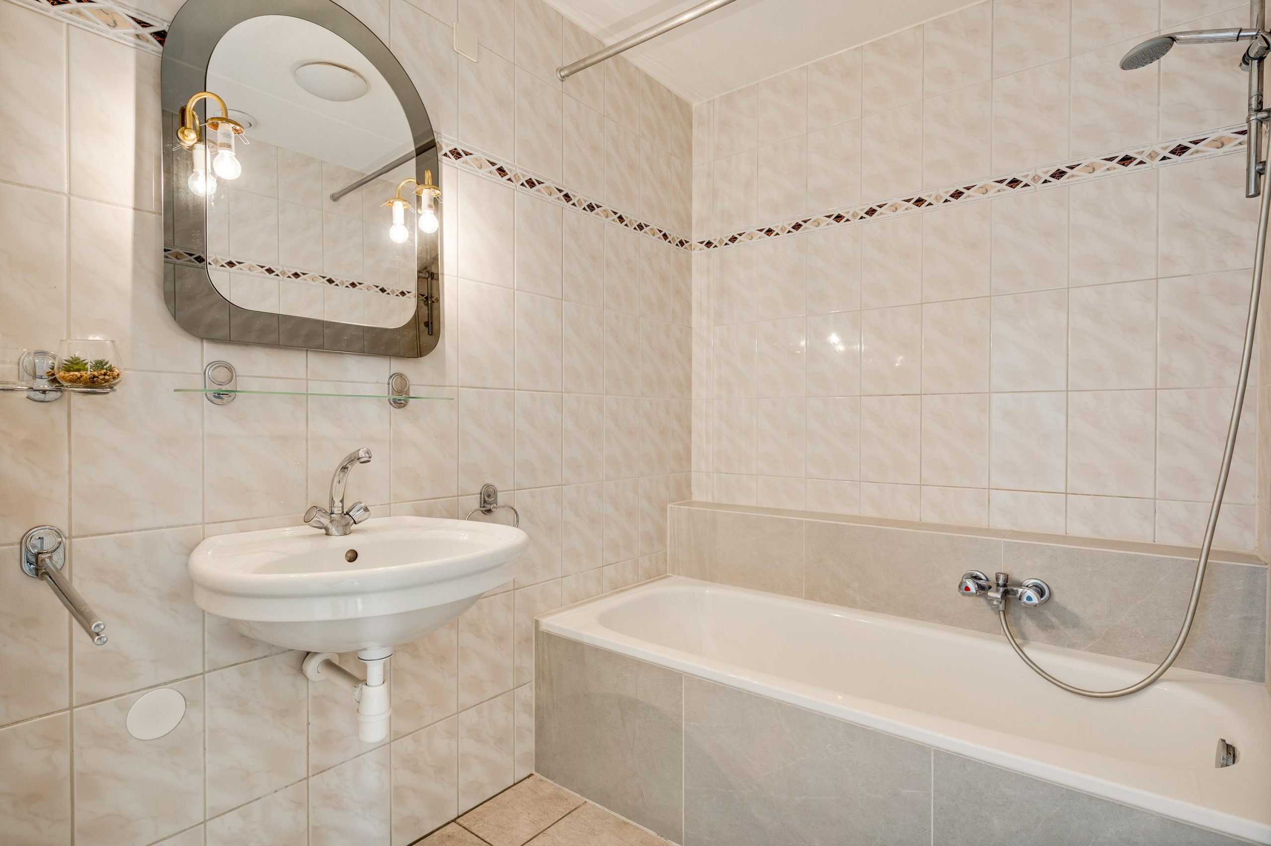 De badkamer is volledig betegeld en voorzien van ligbad en wastafel.