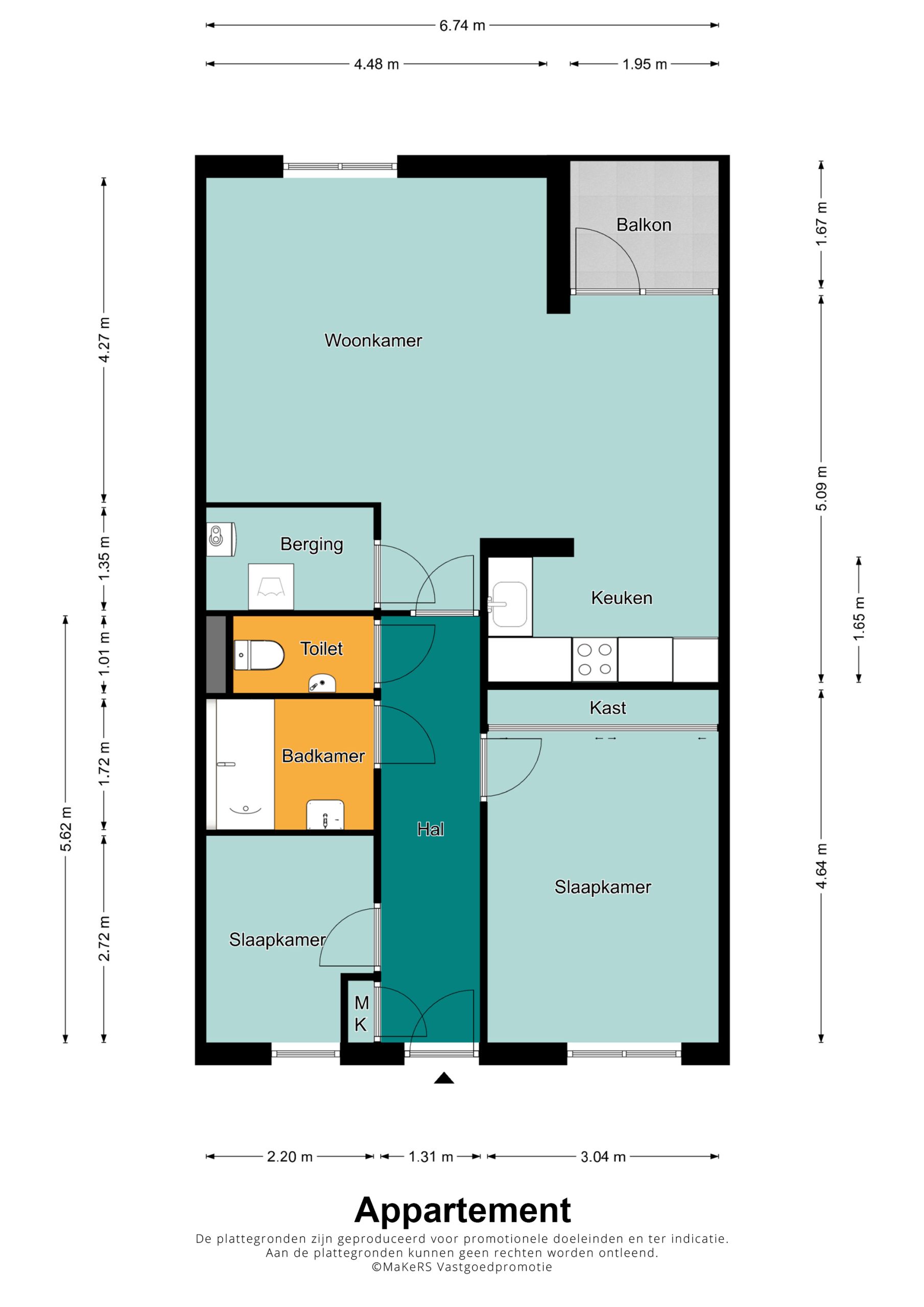 Je komt binnen in de hal met meterkast, vanwaar je toegang hebt tot de verschillende vertrekken. Het appartement beschikt over twee slaapkamers, beiden gelegen aan de achterzijde: