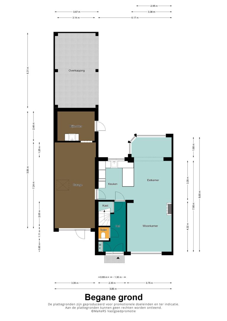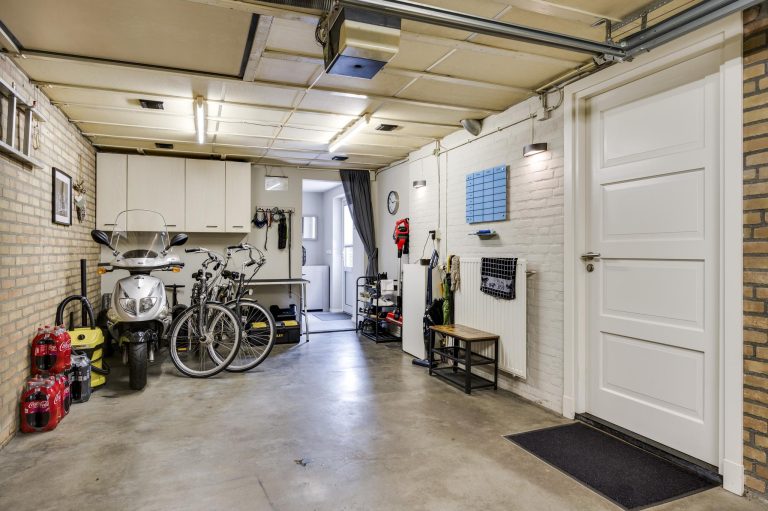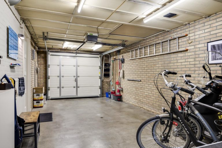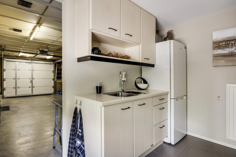 Vanuit de keuken is de ruime garage (ca  7,25 x 3,40m) inpandig bereikbaar. Via een sectionaalpoort met loopdeur is de aan de voorzijde gelegen oprit bereikbaar. Middels een vlizotrap is de bergzolder bereikbaar. Aansluitend aan de achterzijde de bijkeuken (2017) met 2e keukenblok en deur naar achtertuin