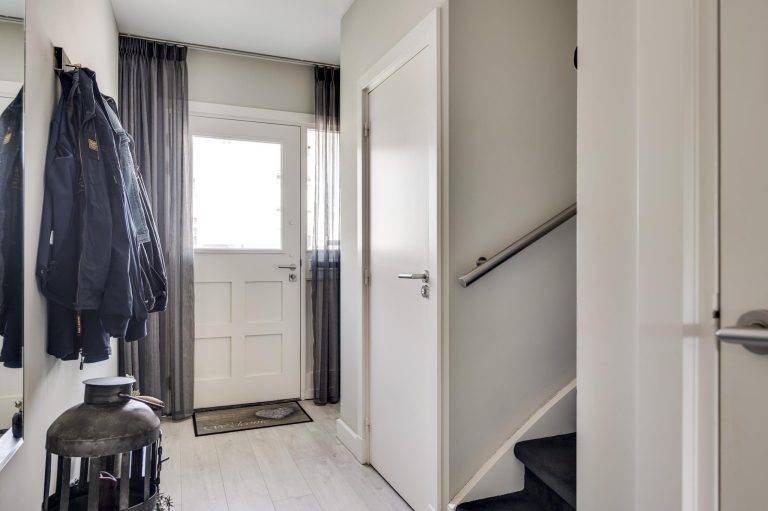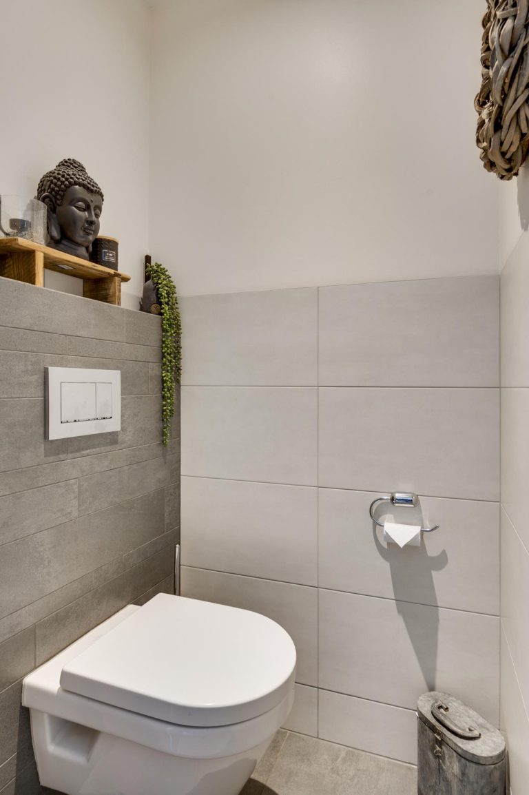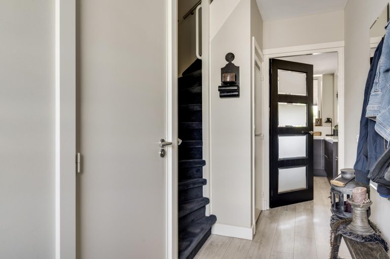 Hal met vernieuwde meterkast, moderne toiletruimte met hangend toilet, trapkast en deur naar keuken.