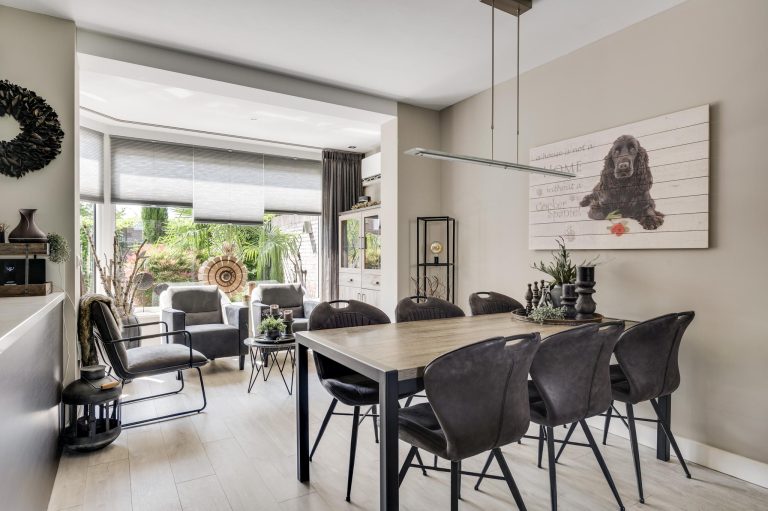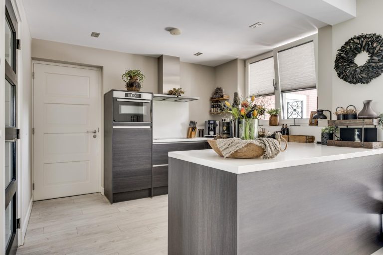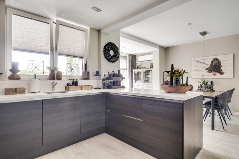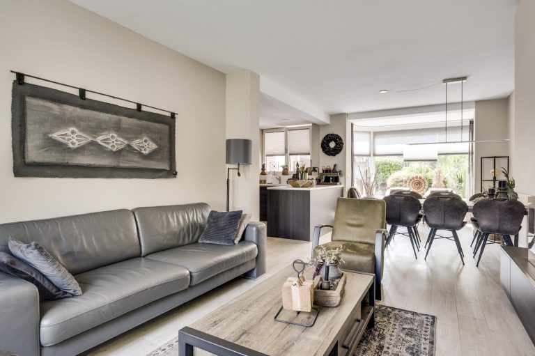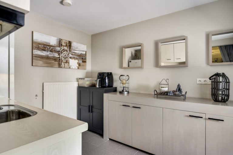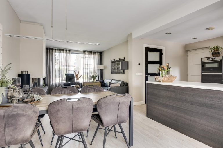 De keuken met moderne u-vormige keukenopstelling (2017) is voorzien van de navolgende apparatuur: 5-pits inductiekookplaat, combi oven-magnetron, afzuigkap, vaatwasser (2024), koelkast en composiet werkblad. De de aan de achterzijde uitgebouwde woonkamer (ca. 9,65 x 3,75m) is voorzien grote raampartijen aan voor- en achterzijde, strak stucwerk wanden, gashaard en airco.