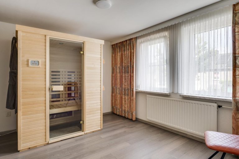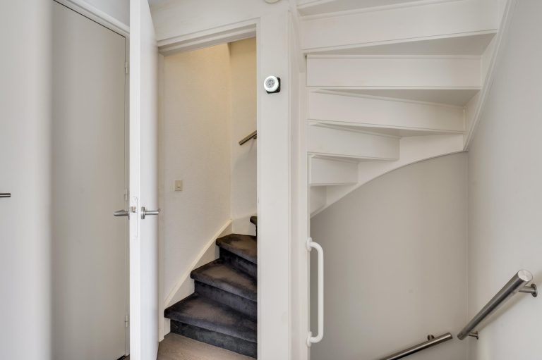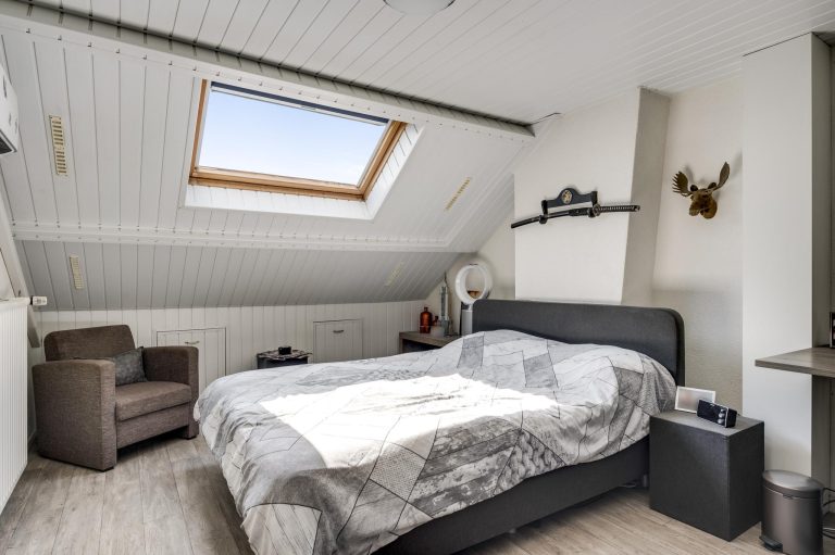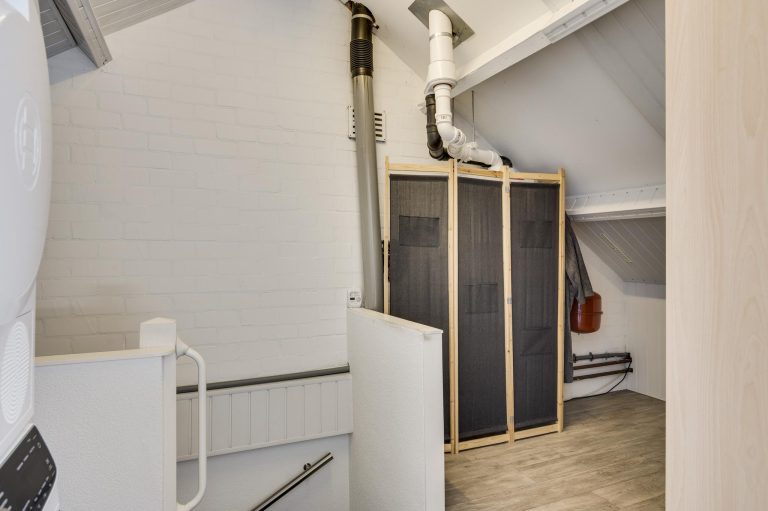 Overloop met aansluiting wasmachine en droger en opstelling ATAG combiketel (2017). De 4e slaapkamer (4 bij 3,40m) is voorzien van ‘Velux’ dakraam, airco en wastafel. Onder de schuine dakdelen is extra bergruimte gecreëerd.