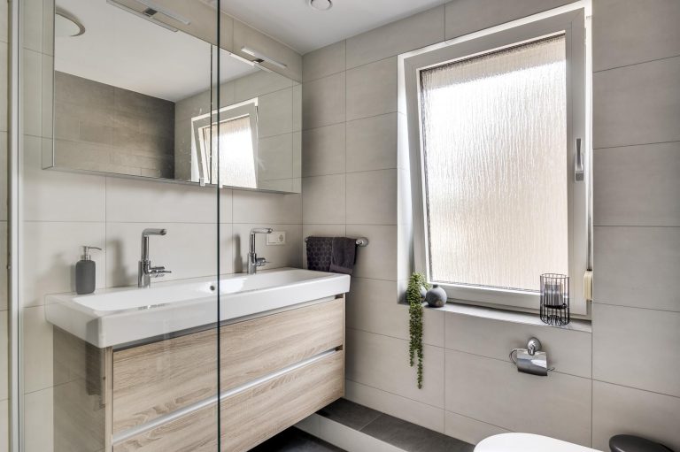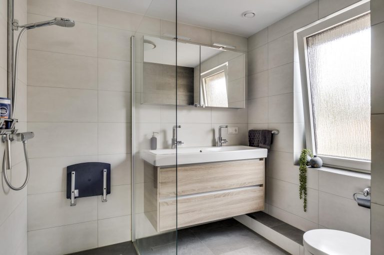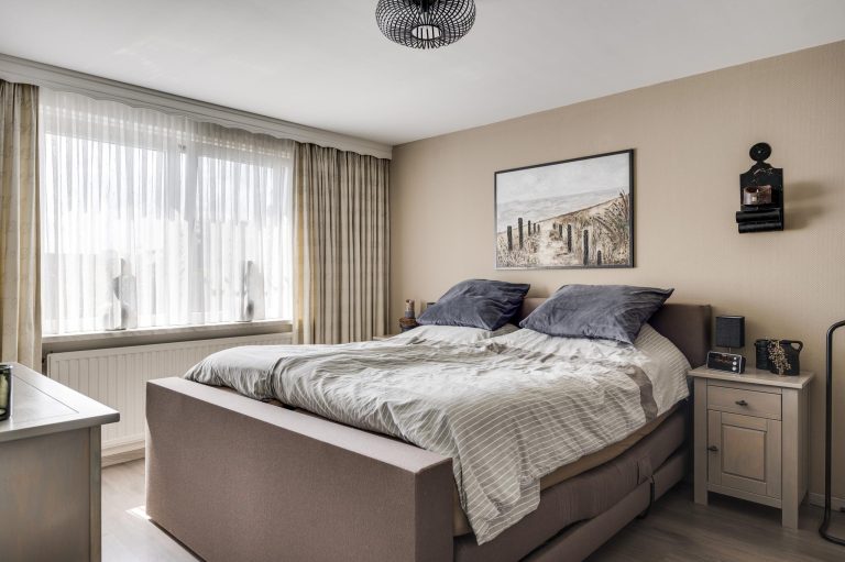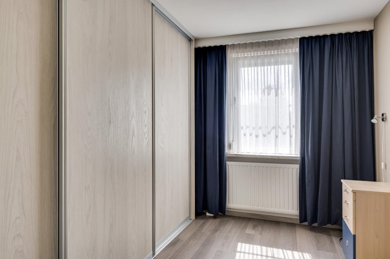 Overloop. Slaapkamer 1, groot 3,75 bij 3,20m, is gelegen aan de voorzijde. De ruime ouderslaapkamer, groot 4,40 bij 3,40, met airco is gelegen aan de achterzijde. De derde slaapkamer (3,3 bij 2,65m) is eveneens gelegen aan de achterzijde en is voorzien van kastenwand en nu in gebruik als kleedkamer. De vernieuwde badkamer (2017) is geheel, modern betegeld met vloerverwarming en voorzien van inloopdouche, dubbele wastafel, spiegel met verlichting, hangend toilet en designradiator.