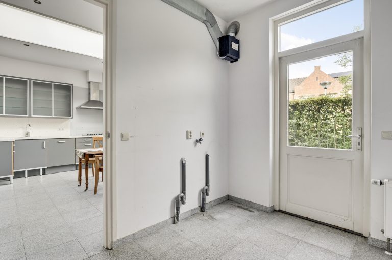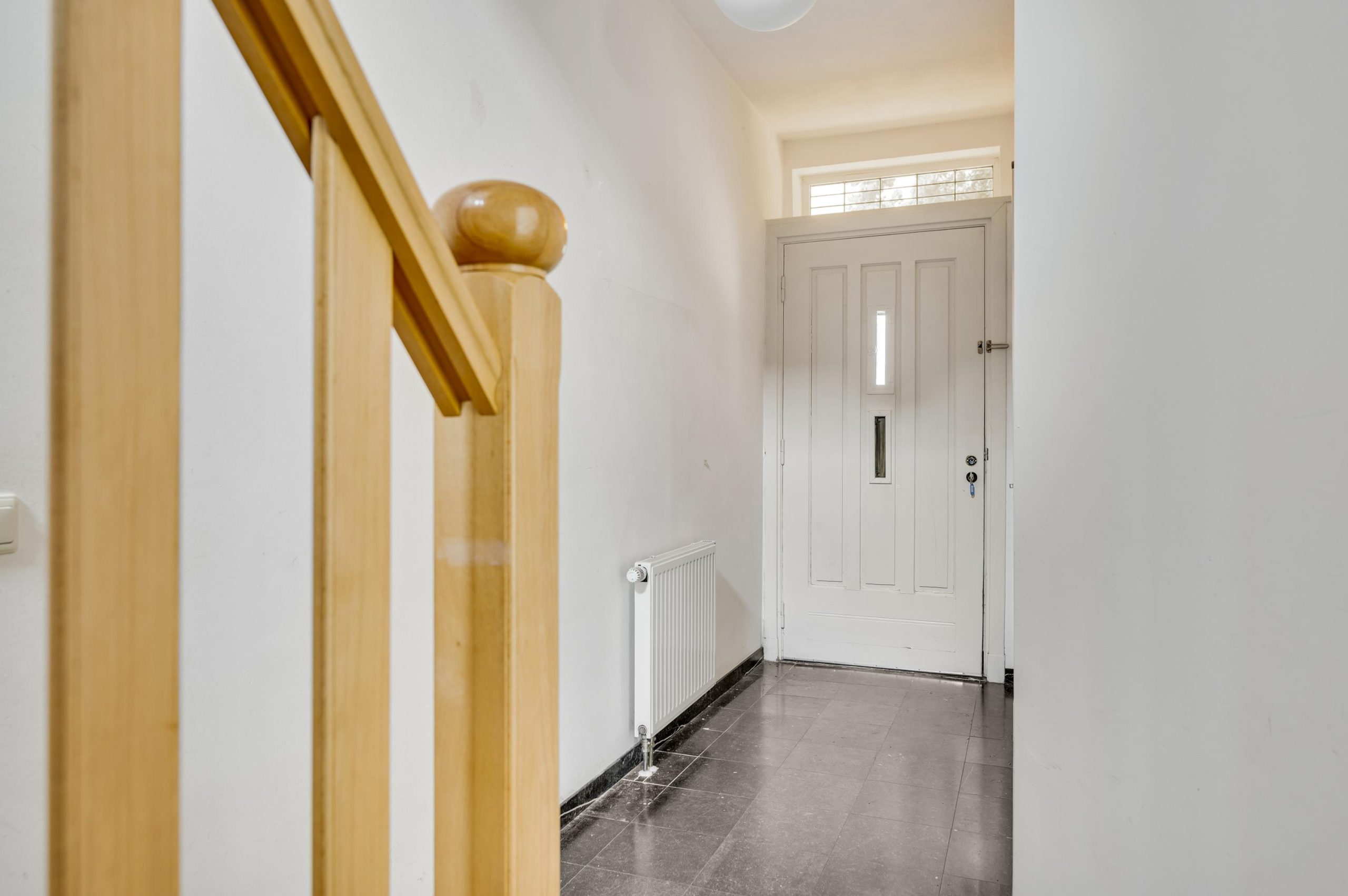 Via de authentieke overdekte entree – met glas-in-lood en originele voordeur – betreedt u de ontvangsthal. Deze hoge, lichte ruimte met paneeldeuren geeft toegang tot de toiletruimte, meterkast en de woonkamer met open keuken.