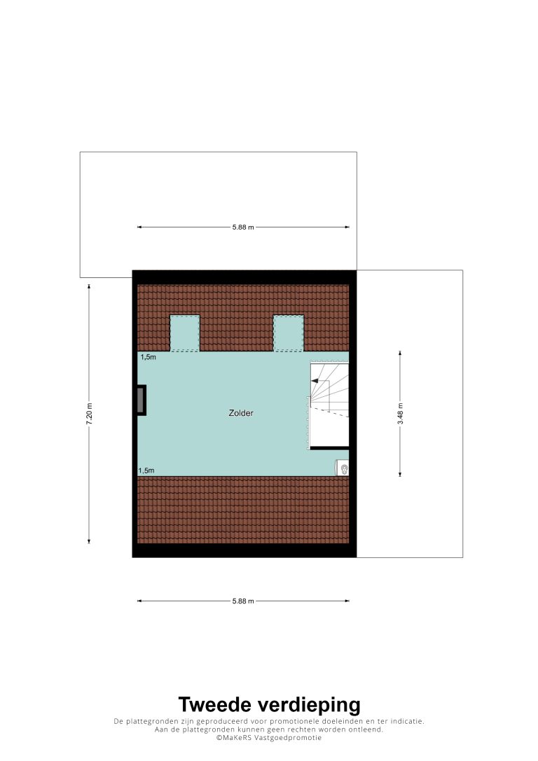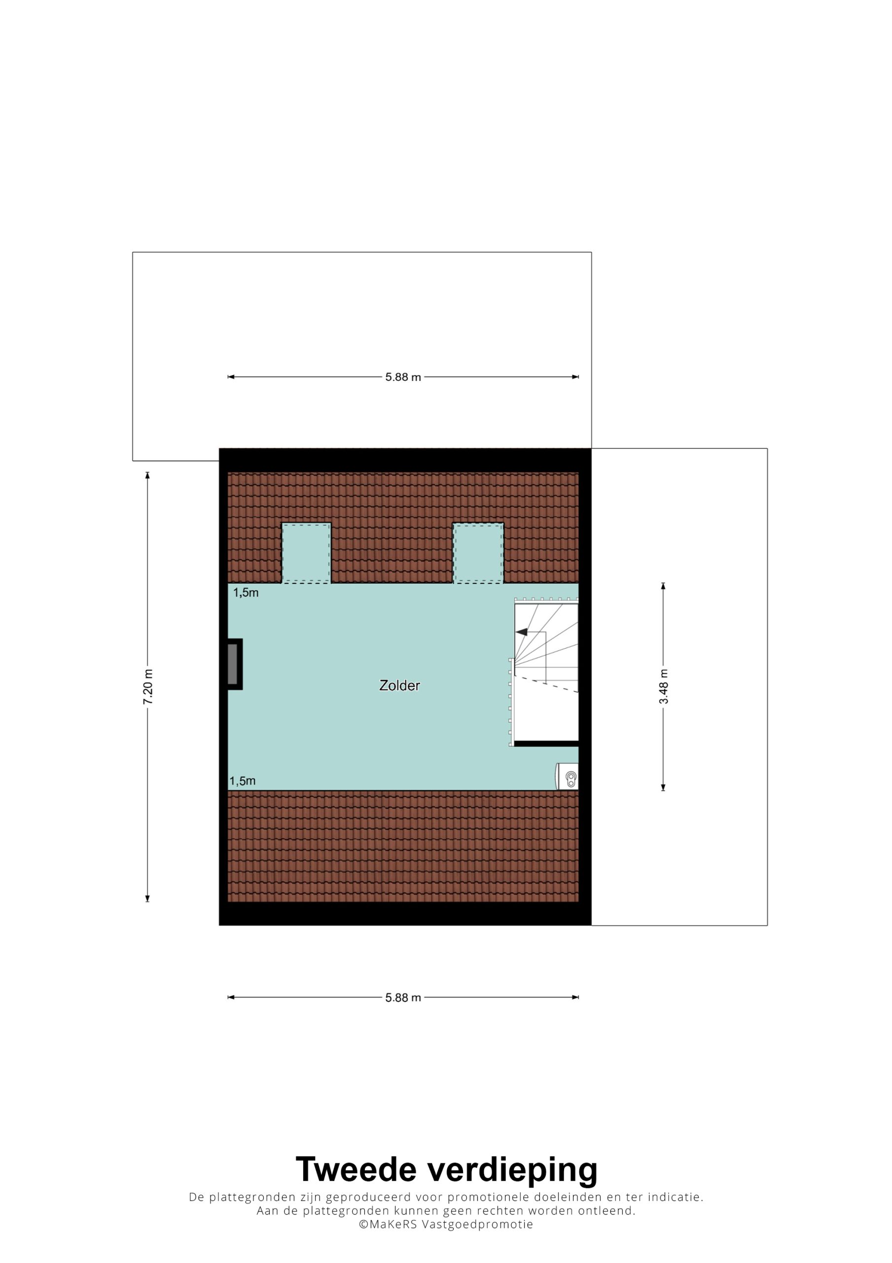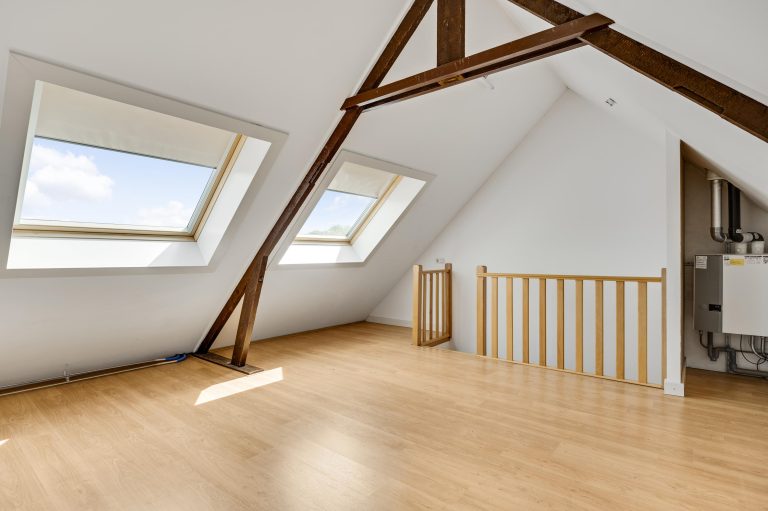 Via een vaste trap bereikt u de ruime zolder. Deze open verdieping heeft twee dakramen, zichtbare dakspanten en laminaatvloer – ideaal als derde slaapkamer, werkruimte of hobbyruimte. Hier bevindt zich tevens de cv-installatie (Nefit Excellent, 2005).