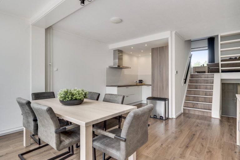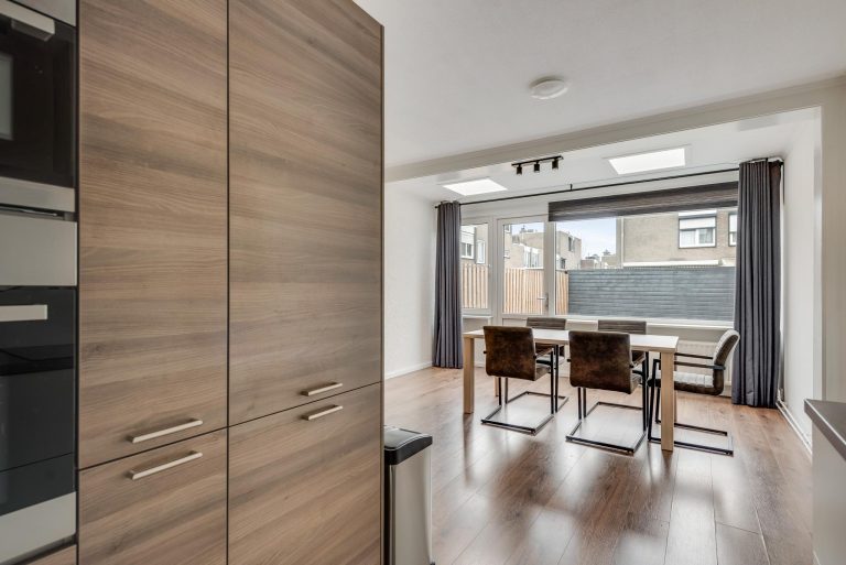 Aan de achterzijde is een aanbouw gerealiseerd, hierdoor is een heerlijk ruime leefkeuken ontstaan van ca. 22m2. De moderne u-opgestelde inbouwkeuken is voorzien van inductiekookplaat, afzuigkap, losse oven, koelkast, combi-oven en vaatwasser. Vanuit de leefkeuken is de achtertuin op het hetzelfde niveau bereikbaar.