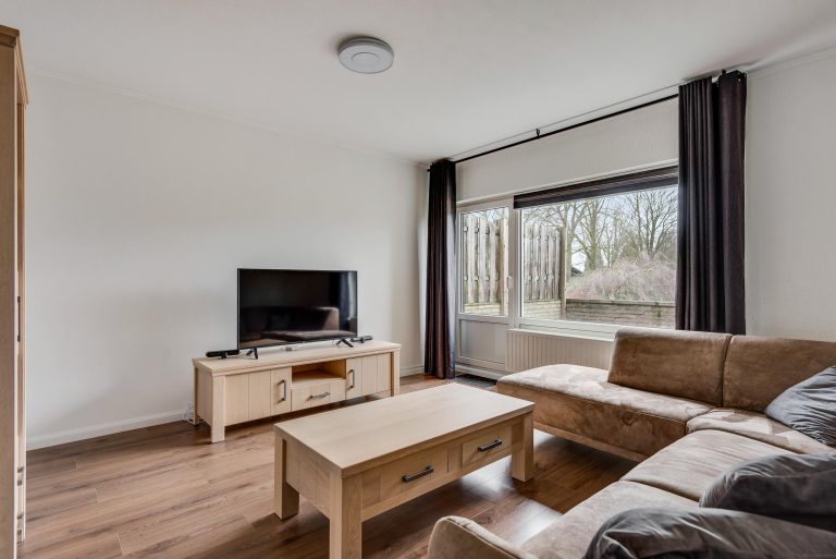 Hier bevindt zich aan de voorzijde van de woning de gezellige woonkamer met grote raampartij en toegang naar het royale dakterras van ca 3 bij 4,5m. Het dakterras is gelegen op het westen en heeft een mooi vrij uitzicht. Hier kun je aan het einde van middag en avond nog heerlijk genieten van de zon.