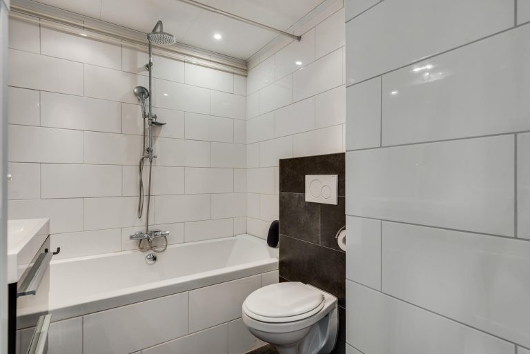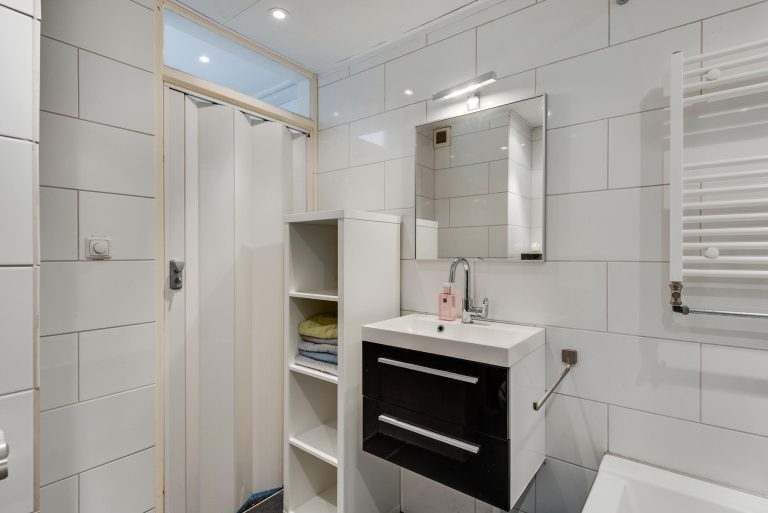 Grote ouderslaapkamer (4,5 x 2,75m) gelegen aan de achterzijde van de woning. De badkamer heeft een ligbad, zwevend toilet, wastafel met meubel en designradiator.