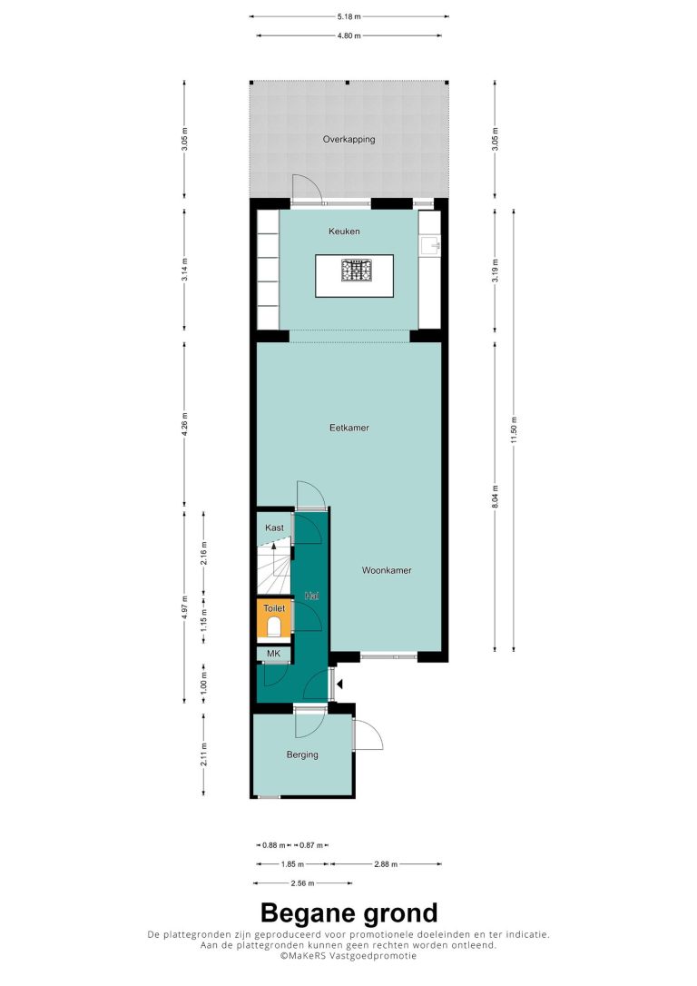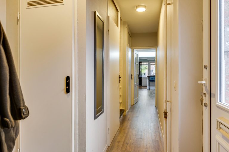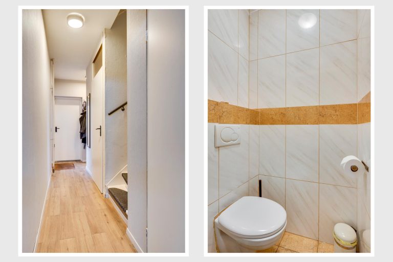 Entree naar hal met meterkast, toegang tot de aan de voorzijde gelegen (fietsen-)berging en de geheel betegelde toiletruimte met hangend toilet. Aan het einde van de gang betreedt u de woonkamer met aangebouwde keuken. Laat u verrassen door de ruimte !.