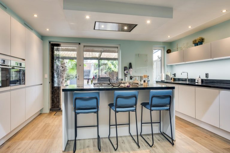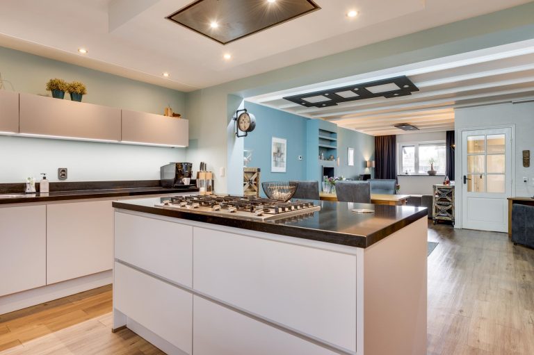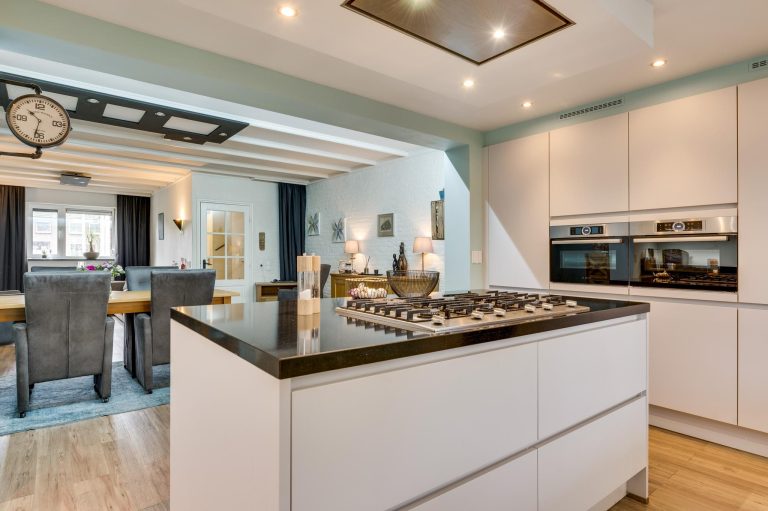 Aan een zijde bevindt zich een grote kastenwand met 2 koelkasten, een oven en stoomoven. Aan de andere zijde bevindt zich het spoelgedeelte met spoelbak, ‘quooker’, vaatwasser, granieten werkblad en wederom veel kastruimte. Centraal in het midden van de ruimte bevindt zich het kookeiland met 6-pits gaskookplaat, afzuigkap (in plafond), granieten werkblad, bergruimte in lades aan de ene zijde en een bar / zitgedeelte aan de andere zijde met zicht naar de tuin.