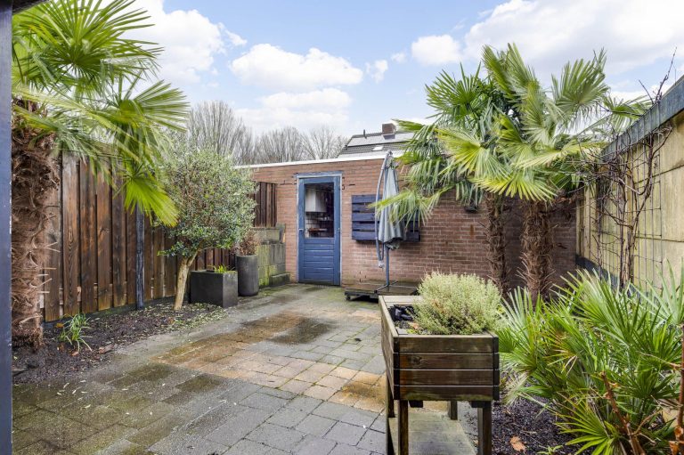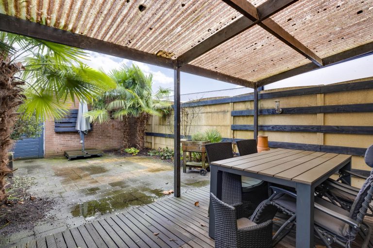 De op het noordoosten gelegen achtertuin is onderhoudsvrij aangelegd met aansluitend aan de keuken een overkapping. Hier zit u in de zomer heerlijk in de schaduw, maar ook bij wat frissere weersomstandigheden kunt u hier al heerlijk zitten.