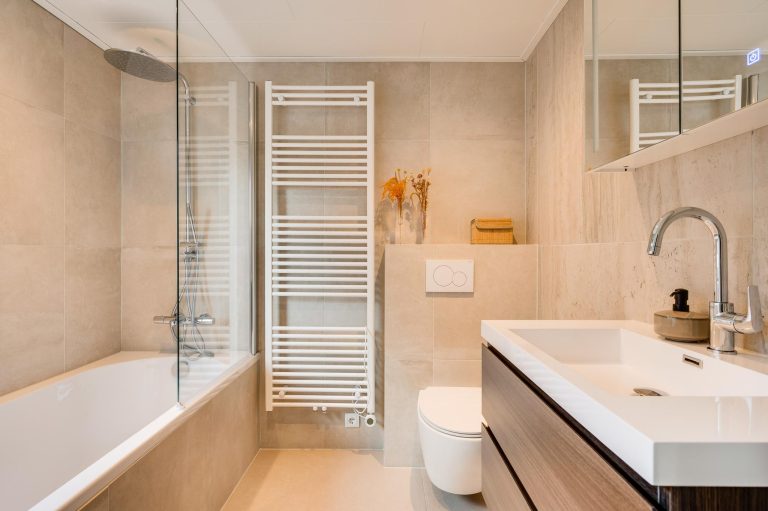 Overloop, drie ruime slaapkamers met laminaatvloer en rolluiken. Alle wanden en plafonds zijn strak afgewerkt. De moderne badkamer heeft vloerverwarming en een elektrische designradiator en is voorzien van een ligbad, toilet en vaste wastafel met badkamermeubel.