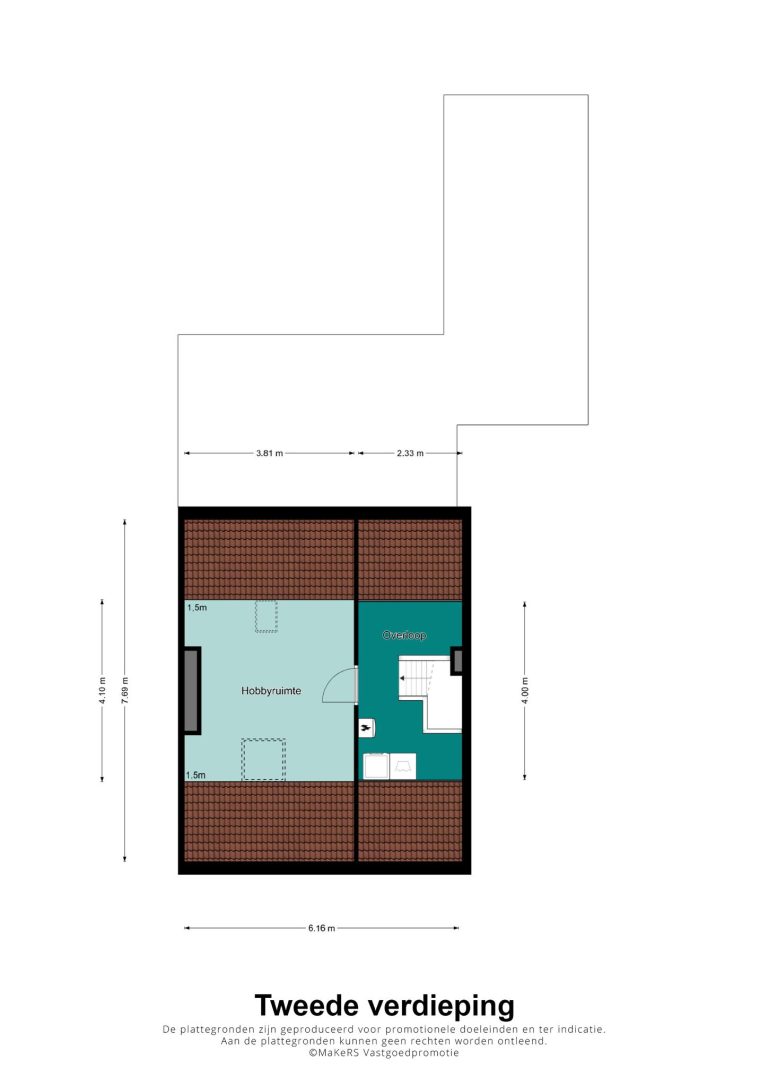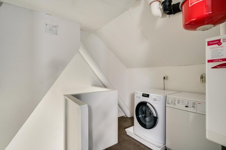 Middels vaste trap is de tweede verdieping te bereiken. Hier kom je boven op een overloop die is ingericht als wasruimte. Met de aansluitingen voor de wasmachine en opstelling cv-ketel. Aansluitend de slaap-/hobbykamer met aan twee zijden een dakraam.