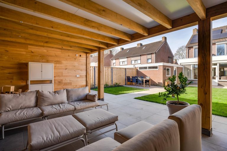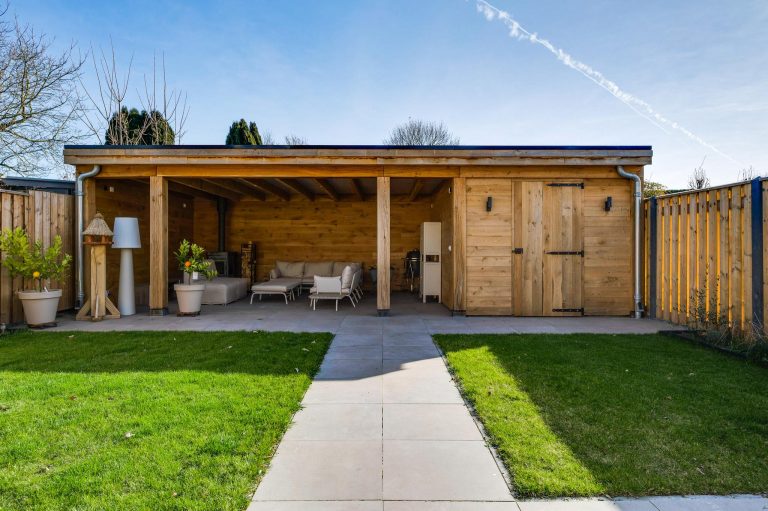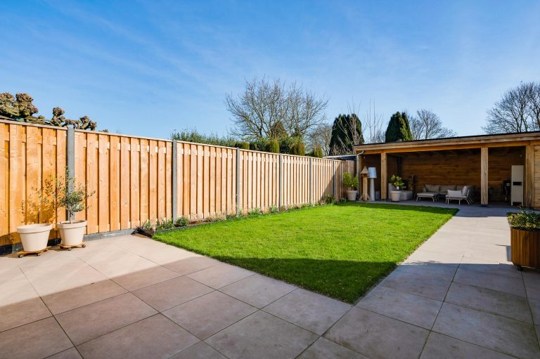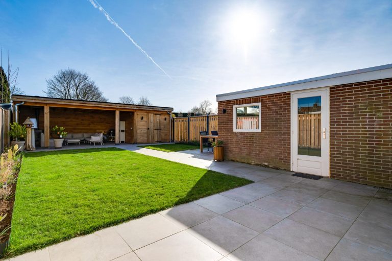 De voortuin is keurig en onderhoudsvriendelijk aangelegd. De achtertuin is in 2024 volledig opnieuw aangelegd met twee terrassen, gazon, schutting en een prachtige overkapping met tuinberging. De loungeruimte met ruime berging van in totaal 9 x 4 meter is gemaakt van eikenhout. Er is geen inkijk in de tuin, aan de achterzijde staat enkel laagbouw.