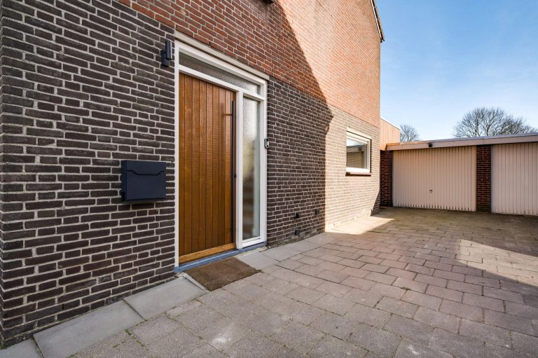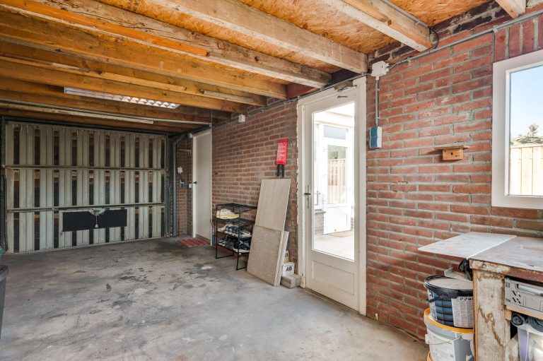 De garage is inpandig bereikbaar, vanuit de aanbouw van de woning. De garage heeft een kantelpoort aan de voorzijde en een loopdeur naar de tuin. Er is een aansluiting voor water en elektra aanwezig.