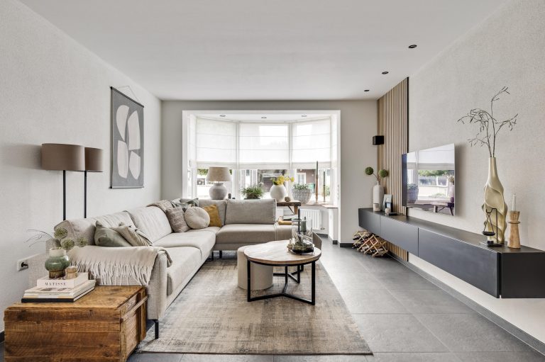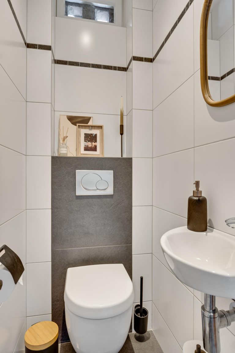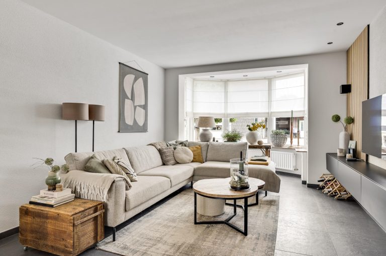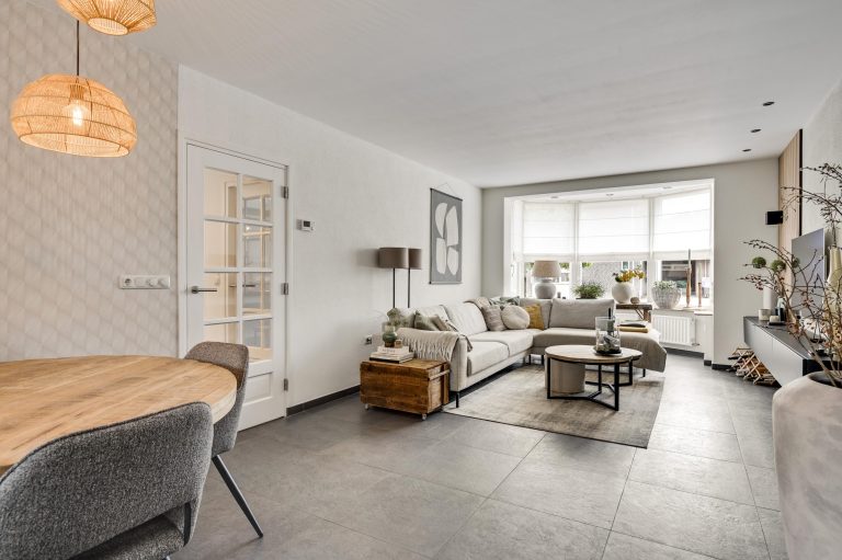Via de ruime hal met meterkast en moderne toiletruimte kom je in de lichte woonkamer. De mooie erker aan de voorzijde zorgt voor veel natuurlijke lichtinval en geeft het geheel een gezellige uitstraling.