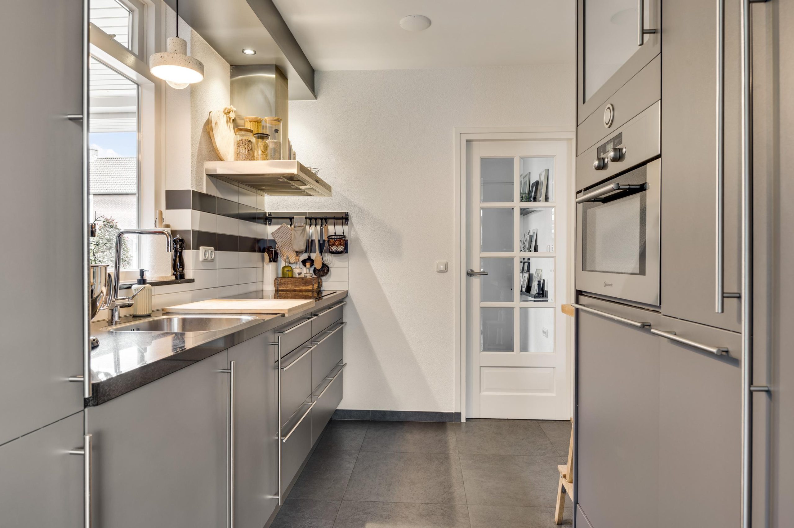 De inpandig bereikbare garage is recent volledig opgeknapt en geïsoleerd en omgebouwd tot ruime bijkeuken. De ruimte is voorzien van tegelvloer, verwarming en wateraansluiting.