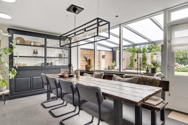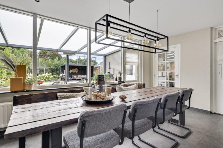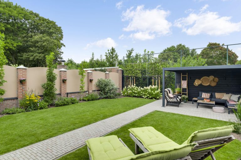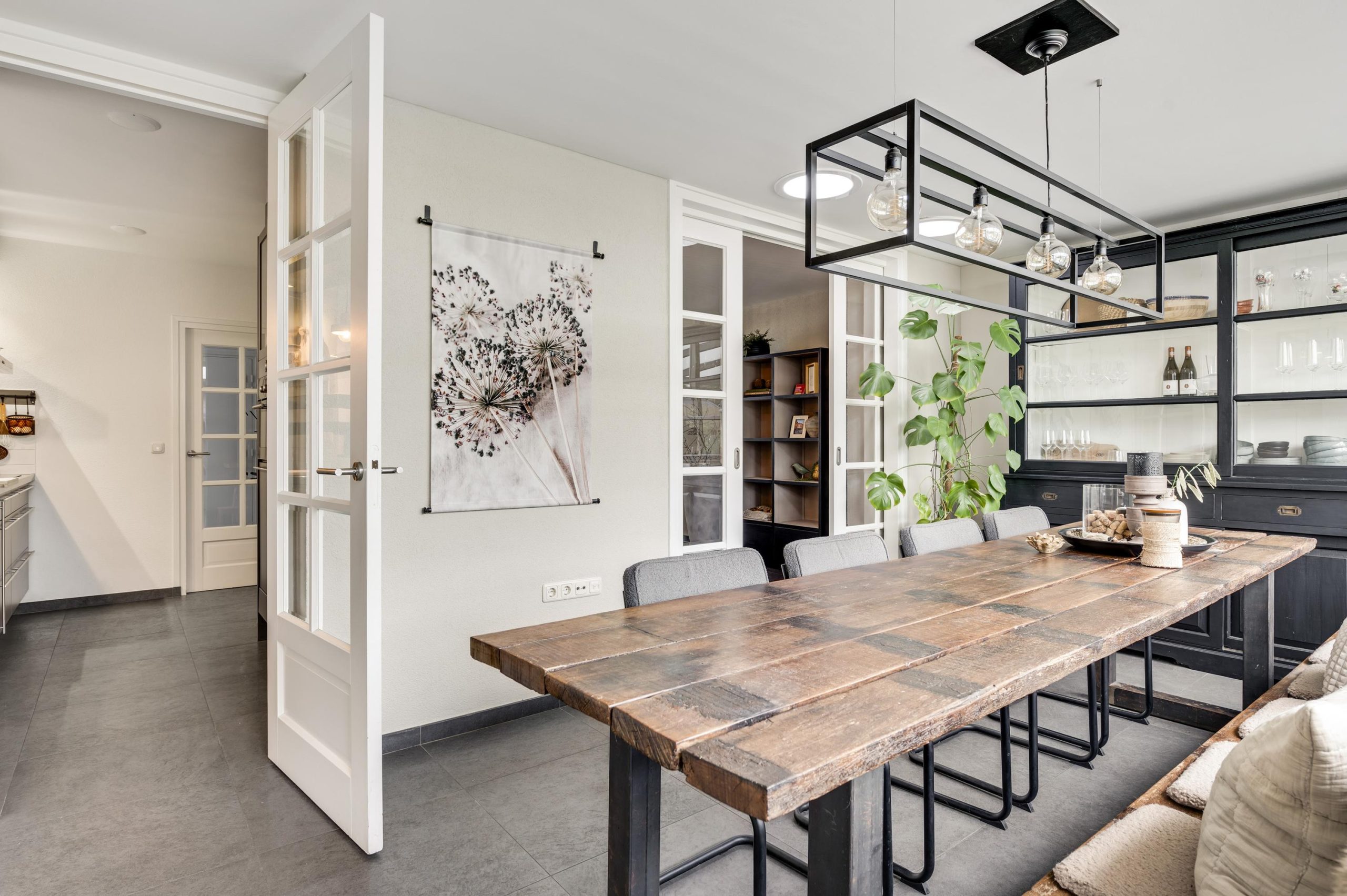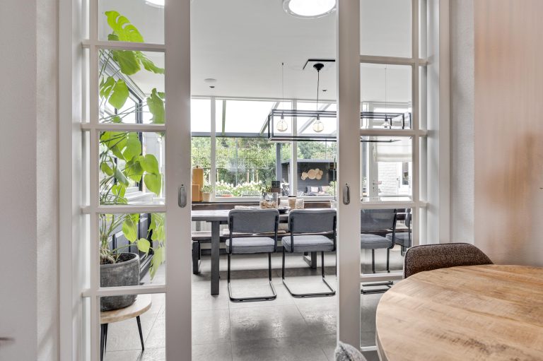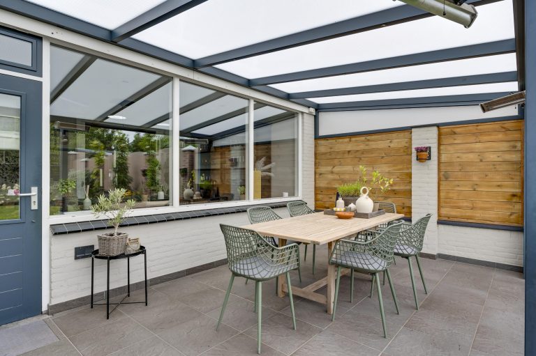 Aansluitend vind je de tuinkamer: een heerlijke plek om te relaxen, te werken of te dineren met uitzicht op de fraai aangelegde tuin.