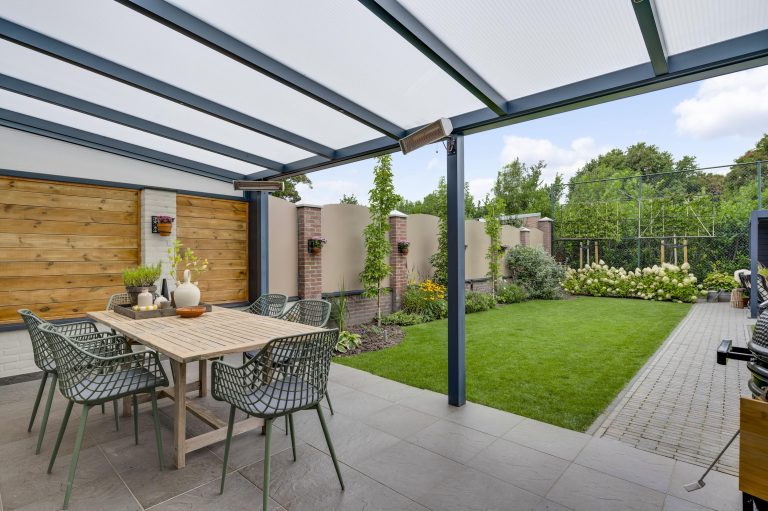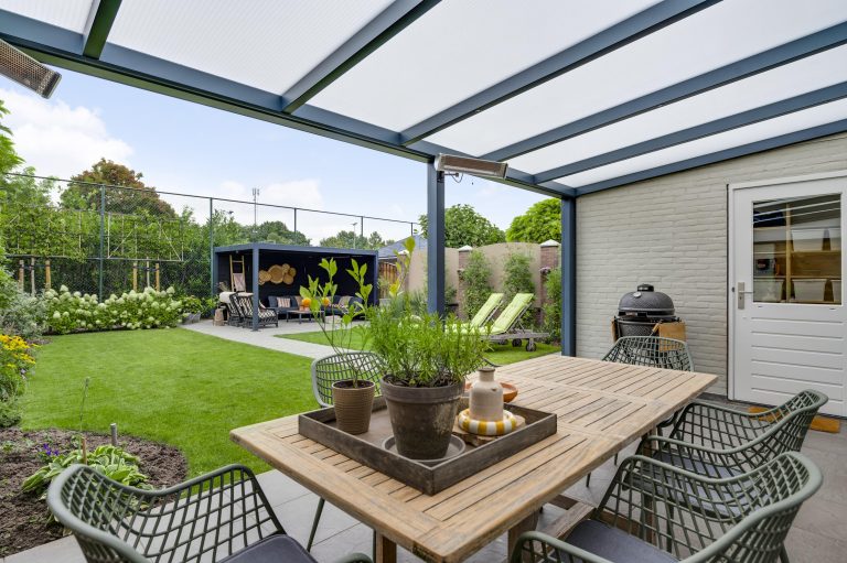 Aansluitend aan de woning bevindt zich tevens een groot overdekt terras, zodat je ook op minder zonnige dagen buiten kunt zitten.