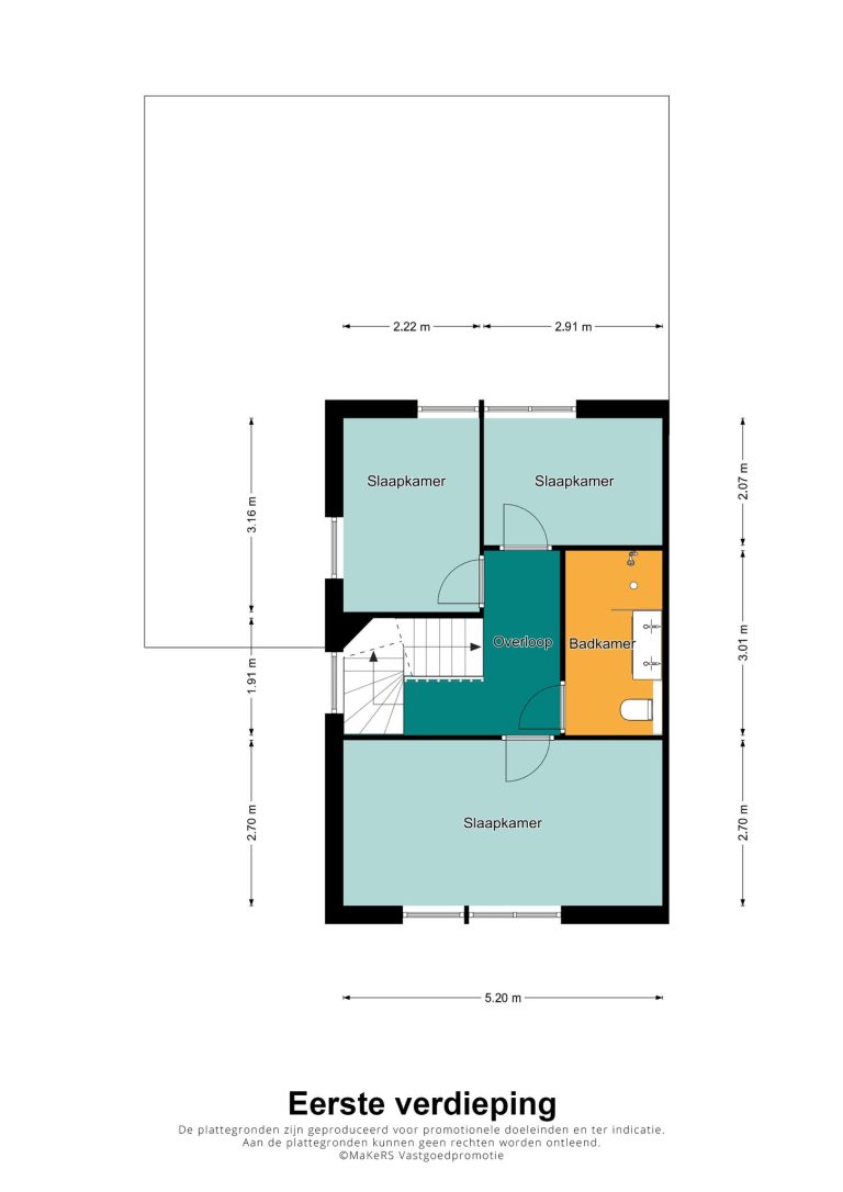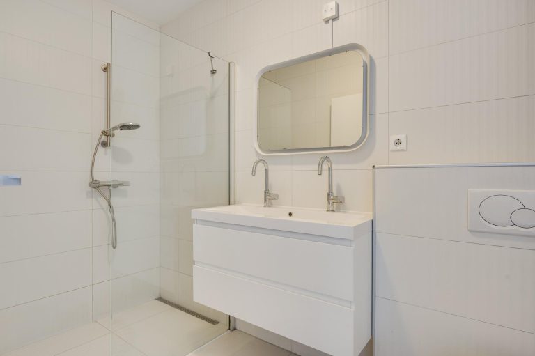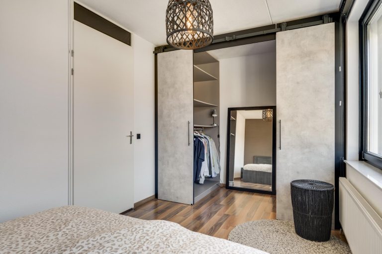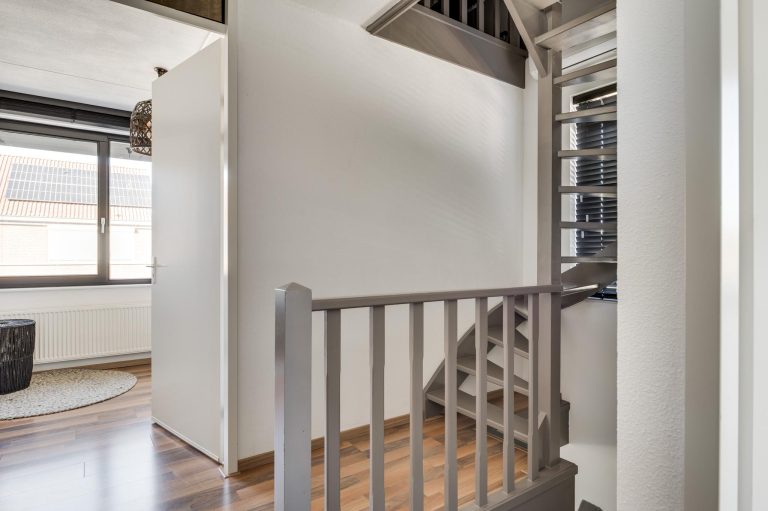 Overloop met toegang tot 3 slaapkamers en de badkamer. De ouderslaapkamer (ca. 5,20 x 2,70 m) is gelegen aan de voorzijde van de woning en heeft een ruime inloopkast met schuifdeuren. De overige slaapkamers liggen aan de achterzijde. De moderne, geheel betegelde badkamer is voorzien van dubbele wastafel, royale inloopdouche en hangend toilet.