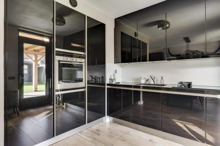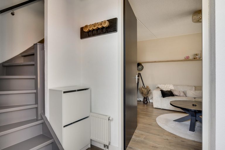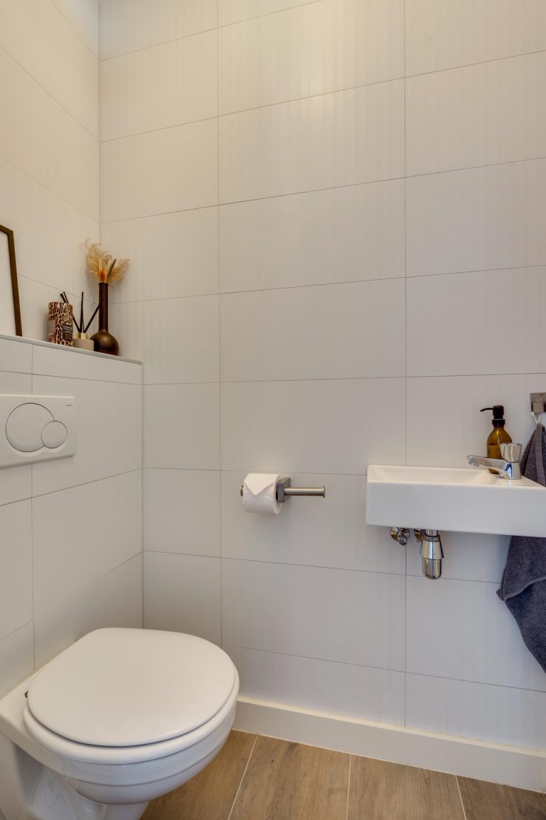 Via oprit bereikbare entree, gelegen in de zijgevel. Ontvangsthal met meterkast, garderobe en geheel betegelde toiletruimte, voorzien van hangend toilet en fonteintje. Vanuit de hal is de L-vormige woonkamer, gelegen aan de voorzijde, bereikbaar. Tussen de woonkamer en keuken bevindt zich de trapkast voor extra bergruimte. De open keuken is gelegen aan de achterzijde van de woning. Deze heeft een moderne, hoekopgestelde keuken met inductiekookplaat, afzuigkap, koelkast, vaatwasser én Quooker. Middels een deur is de achtertuin bereikbaar.