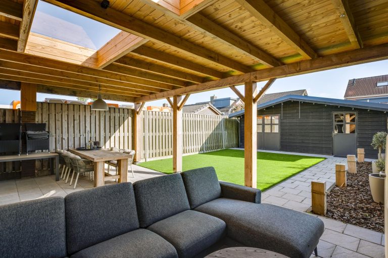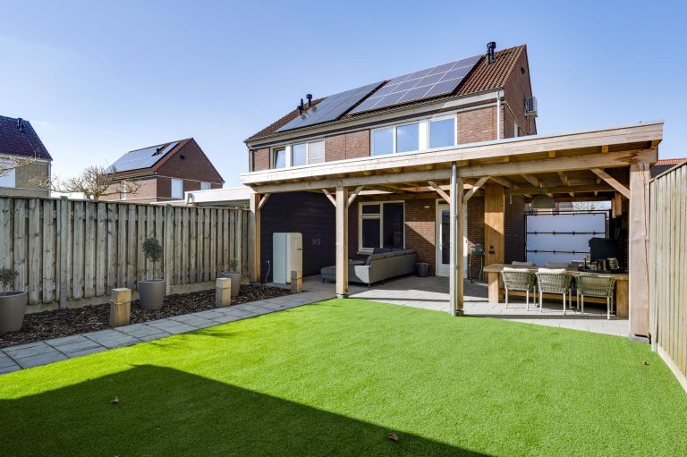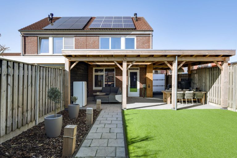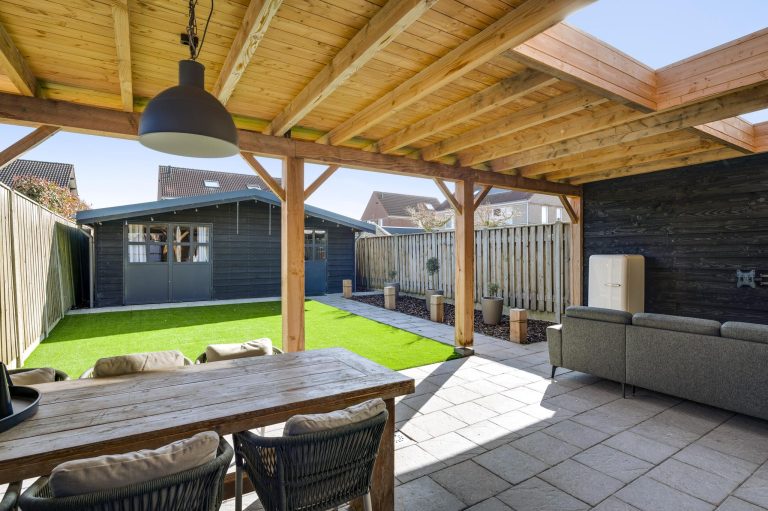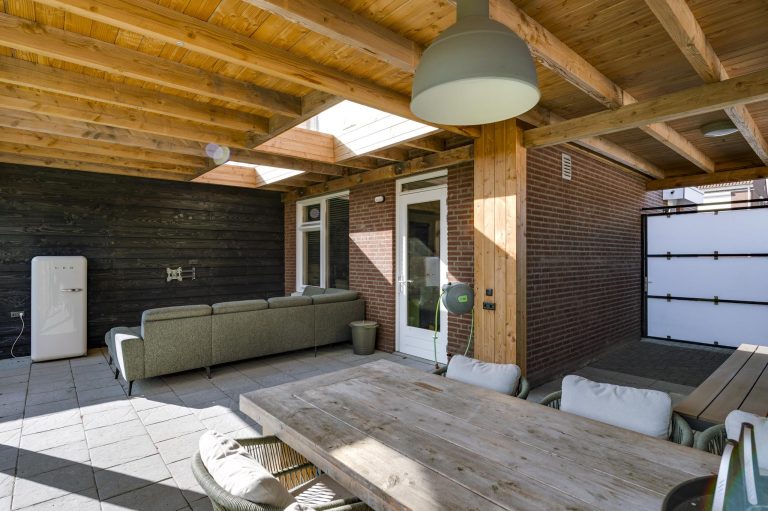 De carport vormt één geheel met de royale tuinoverkapping, die de volledige breedte aan de achterzijde van de woning bestrijkt. Deze tuinoverkapping, van ca. 5 bij 8m, is een absolute meerwaarde voor de woning door de beschutting die deze biedt op de wat frissere momenten en schaduw op warme dagen. Hier kunt u lang en heerlijk vertoeven!