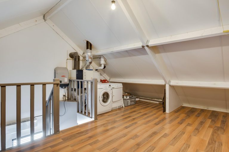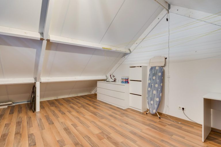 Via een vaste trap is de ruime zolder bereikbaar. Dit is nu een open ruimte met de Nefit HR CV-combiketel (2017), WTW-unit en aansluiting voor wasmachine / droger.  Door de royale afmeting kan hier, door het plaatsen van een tussenwand, op een eenvoudige manier een voorzolder met wasruimte en een extra 4e slaap-/hobby/werkkamer worden gerealiseerd. Door het plaatsen van een dakkapel zou er nog meer woonoppervlak worden gecreëerd.