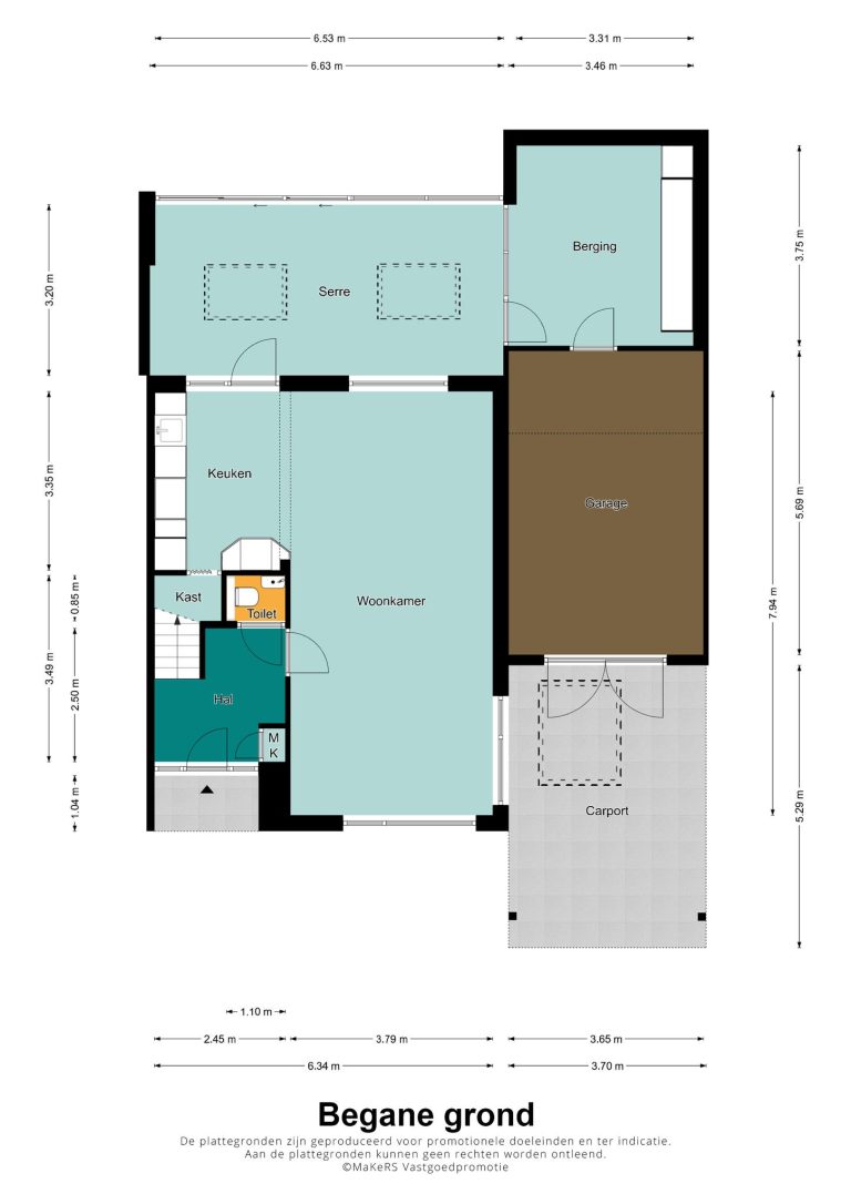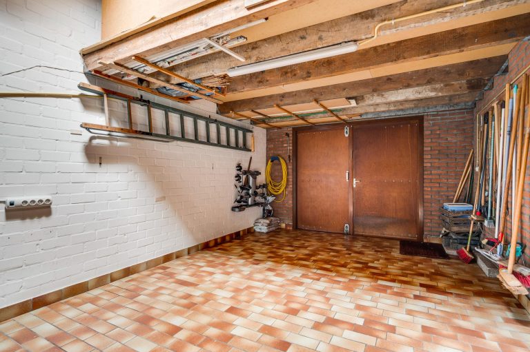 Via de serre bereikt u de berging met deur naar garage. Deze garage (ca 5,7 x 3,65m) heeft een dubbele openslaande deur naar de voorliggende oprit met carport. De vliering biedt extra bergruimte.