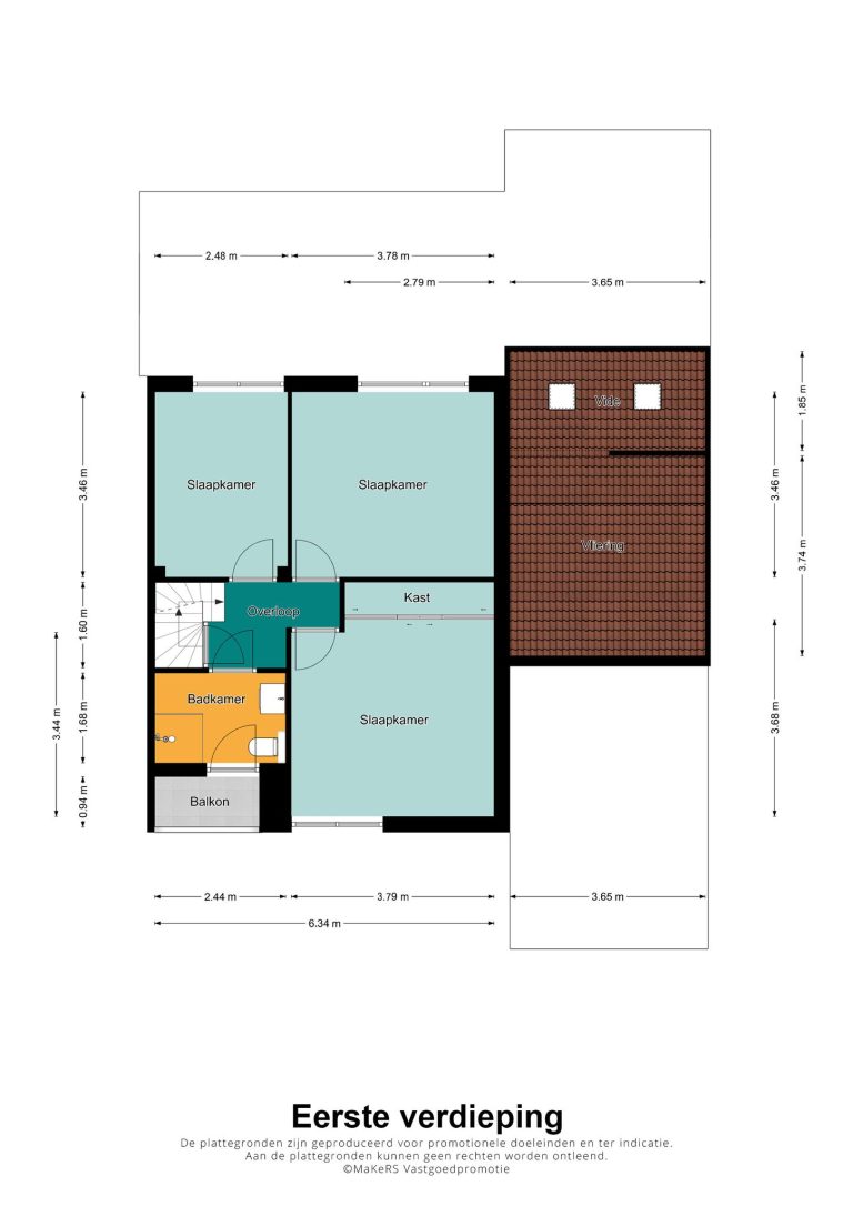 Overloop met toegang tot de 3 slaapkamers (allen voorzien van rolluiken), de vernieuwde badkamer en vaste trap naar zolder. De ruime ouderslaapkamer, groot 3,70 bij 3,80 met inbouwkast is gelegen aan de voorzijde. De tweede slaapkamer (3,45 bij 3,80m) en derde slaapkamer, groot 3,45 bij 2,5m, zijn gelegen aan de achterzijde. Alle slaapkamers zijn voorzien van rolluiken en zeil of laminaatvloer. De vernieuwde badkamer (2018) is geheel, modern betegeld en voorzien van ruime inloopdouche met regendouche en handdouche , badkamermeubel met wastafel, spiegelkast met verlichting, hangend toilet en elektrische vloerverwarming. Vanuit de badkamer is het balkon, gelegen boven de voordeur bereikbaar
