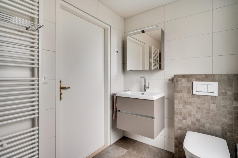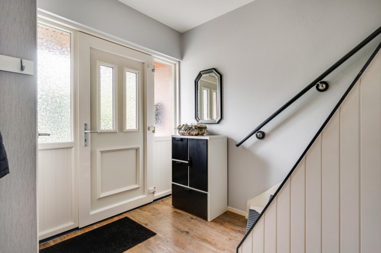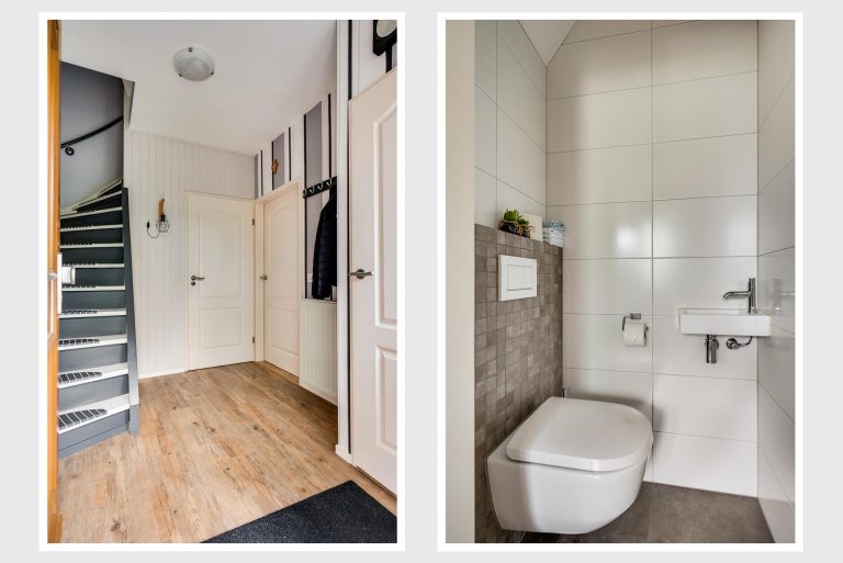 Ruime ontvangsthal voorzien van pvc-vloer, moderne geheel betegelde toiletruimte (2018) met hangend toilet en fonteintje, vernieuwde meterkast en deur naar woonkamer.