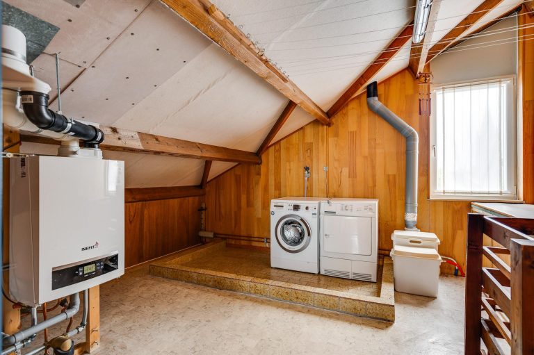 Royale overloop met aansluiting wasmachine en droger en opstelling Nefit combiketel (2017). De 4e slaapkamer (3,15 bij 2,90m) ligt aan de achterzijde. Onder de schuine dakdelen is extra bergruimte gecreëerd.