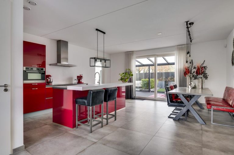 Entree tot de woning gelegen in de zijgevel. Hal met meterkast en moderne toiletruimte voorzien van hangend toilet en fonteintje. De gezellige woonkamer is gelegen aan de voorzijde van de woning. Aan de achterzijde is de woning uitgebouwd waardoor er een zeer ruime leefkeuken is gecreëerd. De luxe keukenopstelling heeft een vaste kastenwand en een kookeiland met barretje waaraan je gezellig kunt zitten. De keuken is voorzien van inductie kookplaat, combi oven/magnetron, koelkast, vaatwasser, afzuigkap en quooker.