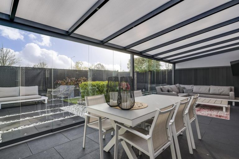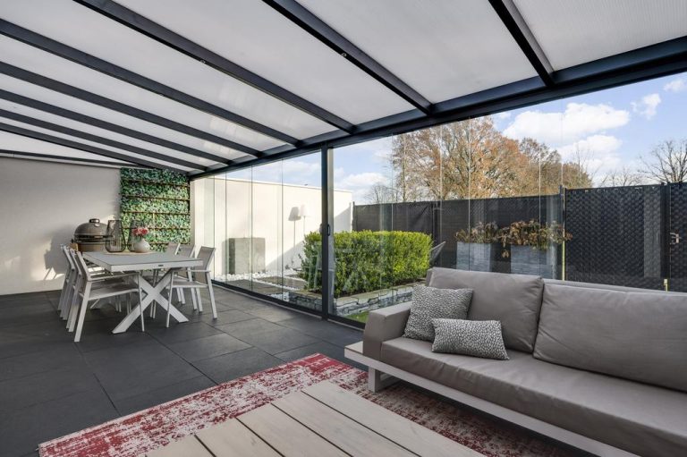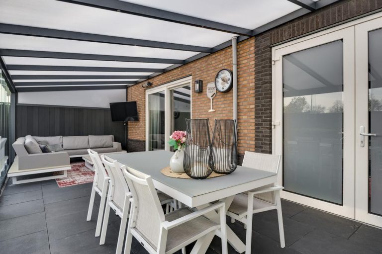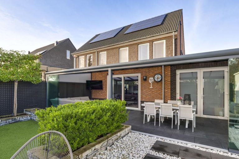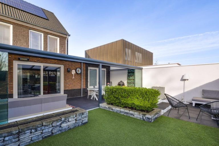 Zowel de voor- als achtertuin zijn smaakvol en onderhoudsvriendelijk aangelegd. Over de volledige breedte van de woning is een terrasoverkapping gerealiseerd, welke afgesloten kan worden middels de glazen schuifdeuren. Dit is een heerlijke plek om een groot gedeelte van het jaar te vertoeven. Hier kun je genieten van de tuin en de zon. De tuin is gelegen op het zuidoosten, biedt optimale privacy en is verder aangelegd met bloembakken, tweede terras en kunstgras. Aan de achterzijde van de woning ligt een doodlopende weg. Via deze weg is de achtertuin te bereiken.