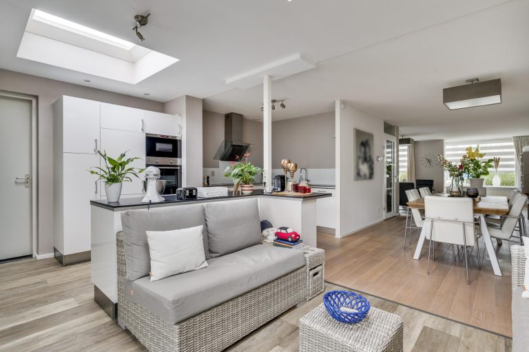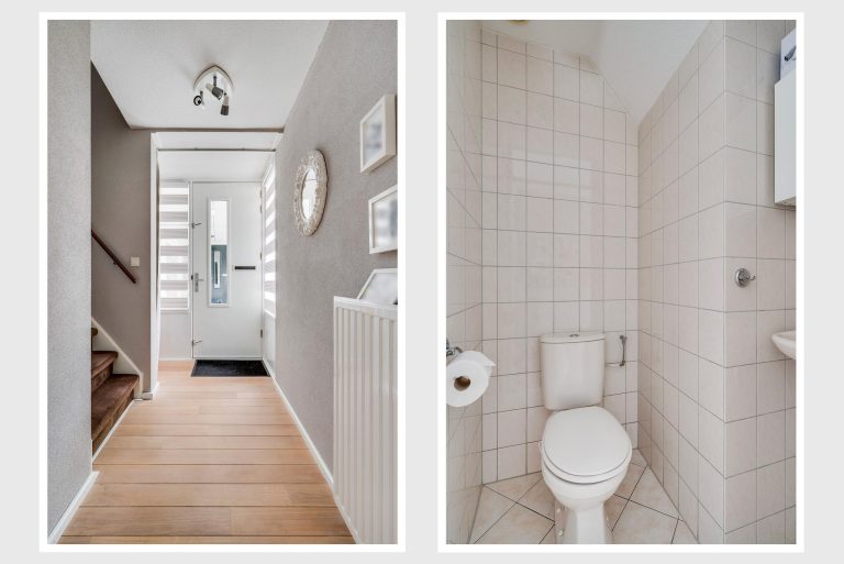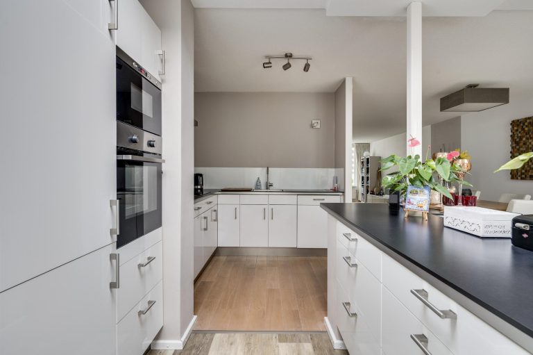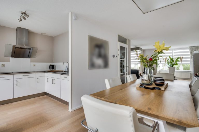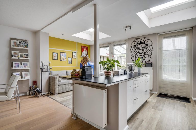 Overdekte entree gelegen in de zijgevel van de woning. Ruime ontvangsthal met meterkast en geheel betegelde toiletruimte voorzien van toilet en fonteintje. Aan de voorzijde van de woning bevindt zich de ruime L-vormige woonkamer met veel daglicht middels de royale raampartijen en erker. Aan de achterzijde de in 2014 uitgebouwde leefkeuken met moderne hoekopgestelde keukenopstelling (2014). De witte hoogglans keuken is voorzien van alle gemakken voorzien zoals een inductiekookplaat, afzuigkap, vaatwasser, oven, magnetron, koelkast en meer dan voldoende berg- en werkruimte. Via een dubbele openslaande deur is de achtertuin met overkapping bereikbaar. De ruime geïsoleerde garage is vanuit de keuken inpandig bereikbaar en beschikt over dubbele openslaande geïsoleerde deuren naar de ruime voorliggende oprit.