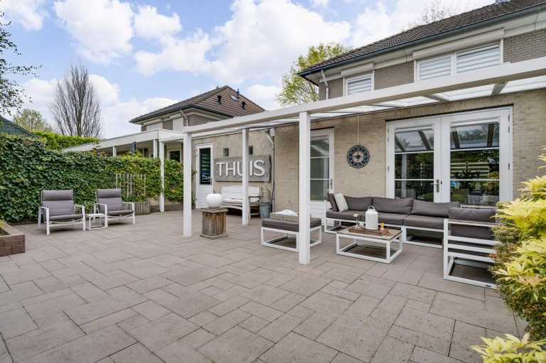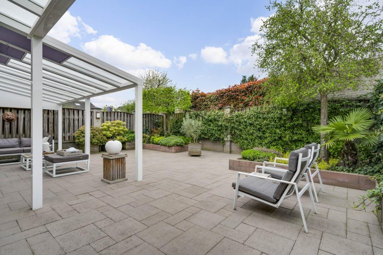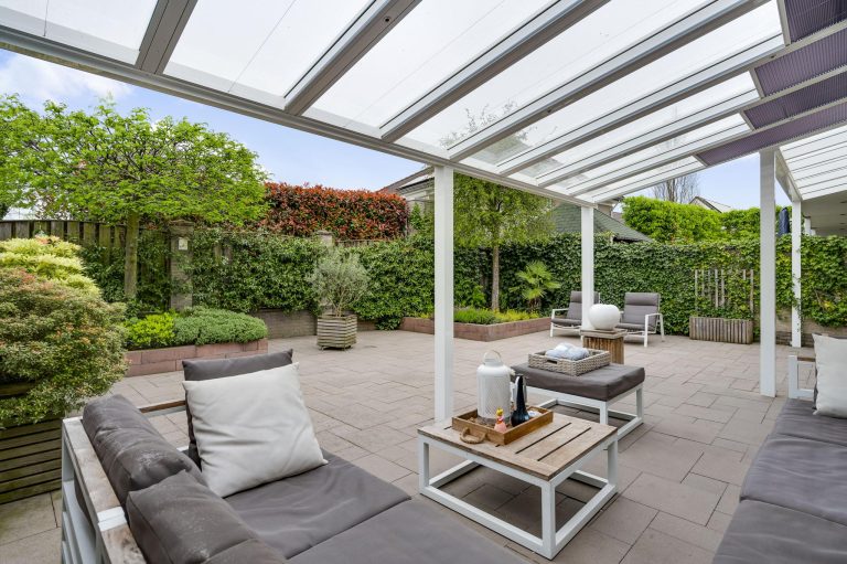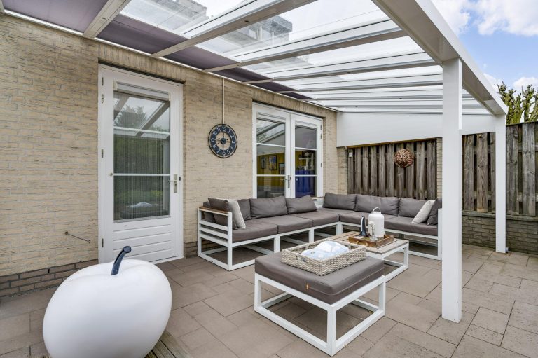 De onderhoudsarme, privacybiedende achtertuin is gelegen op het noordwesten, aangelegd met borders en terras en voorzien van een grote glazen aluminium tuinoverkapping. De tuinoverkapping biedt veel zitruimte en is voorzien van zonwering. De voortuin is eveneens onderhoudsarm aangelegd en heeft een oprit met ruimte voor twee auto’s.