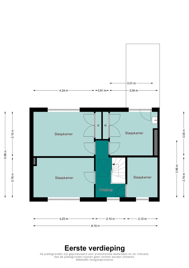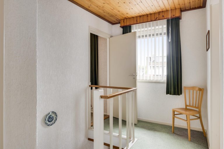 Vanuit de overloop zijn de 4 slaapkamers bereikbaar. Drie slaapkamers zijn royaal van afmeting. Slaapkamer 1 is gelegen aan de voorzijde, groot ca. 4,25 bij 2,76m. Slaapkamer 2 (ca. 4,25 bij 3,10m) en slaapkamer 3 (ca. 3,05 bij 3m) met wastafel, zijn gelegen aan de achterzijde. Slaapkamer 4 tenslotte is gelegen aan de voorzijde (ca. 2,8 bij 2,1m) is wellicht een prima kamer om een badkamer te realiseren.
