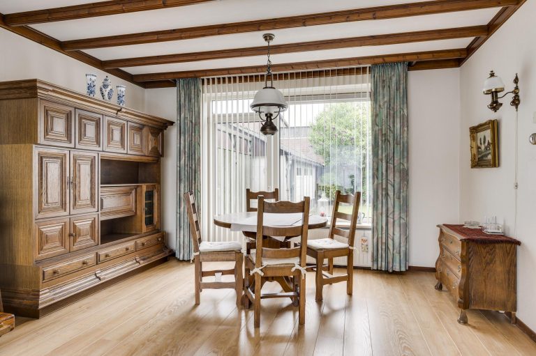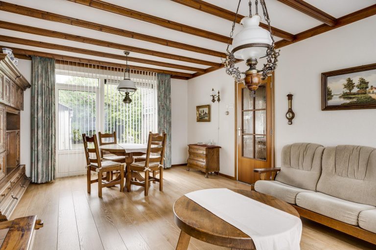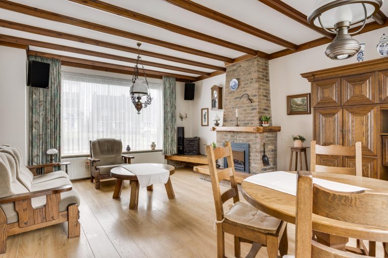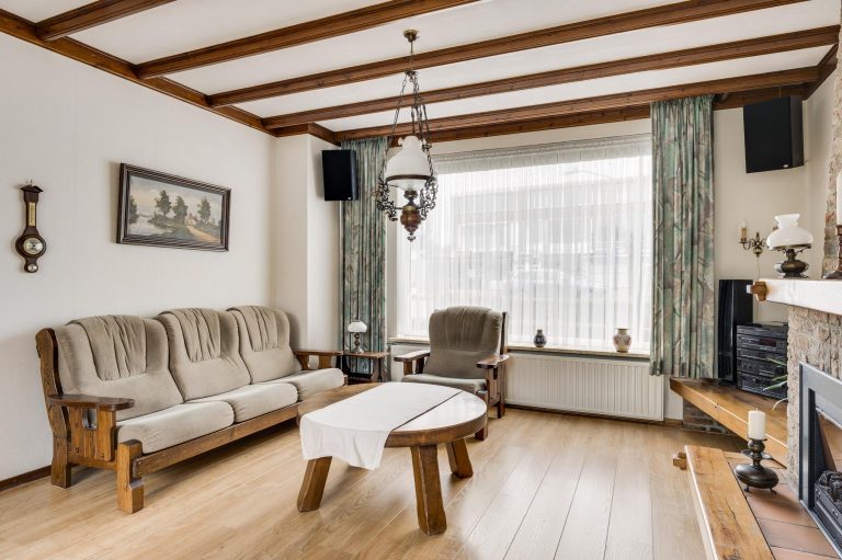 De woonkamer, groot ca 24m2, gelegen aan de linkerzijde van de woning is voorzien van elektrische kachel (voorheen houtkachel) en deur naar achtertuin.