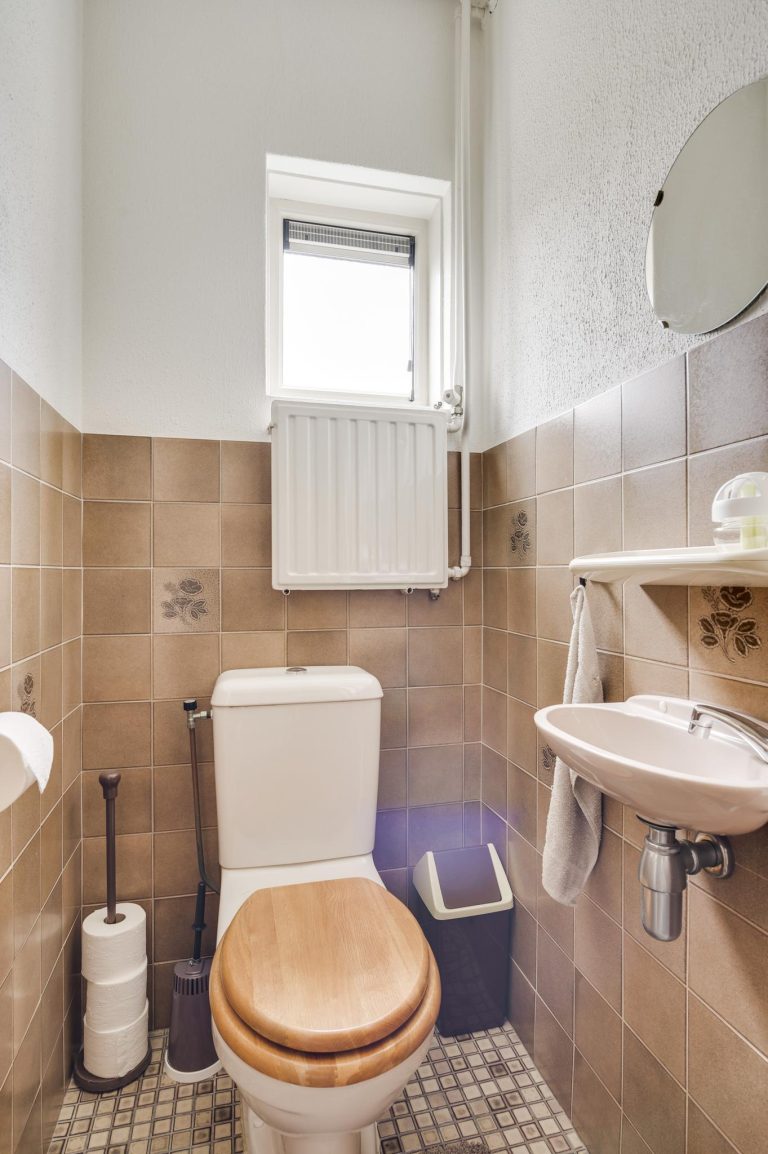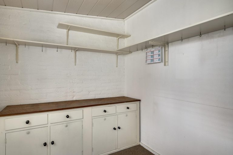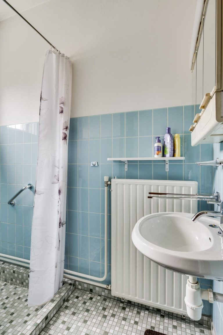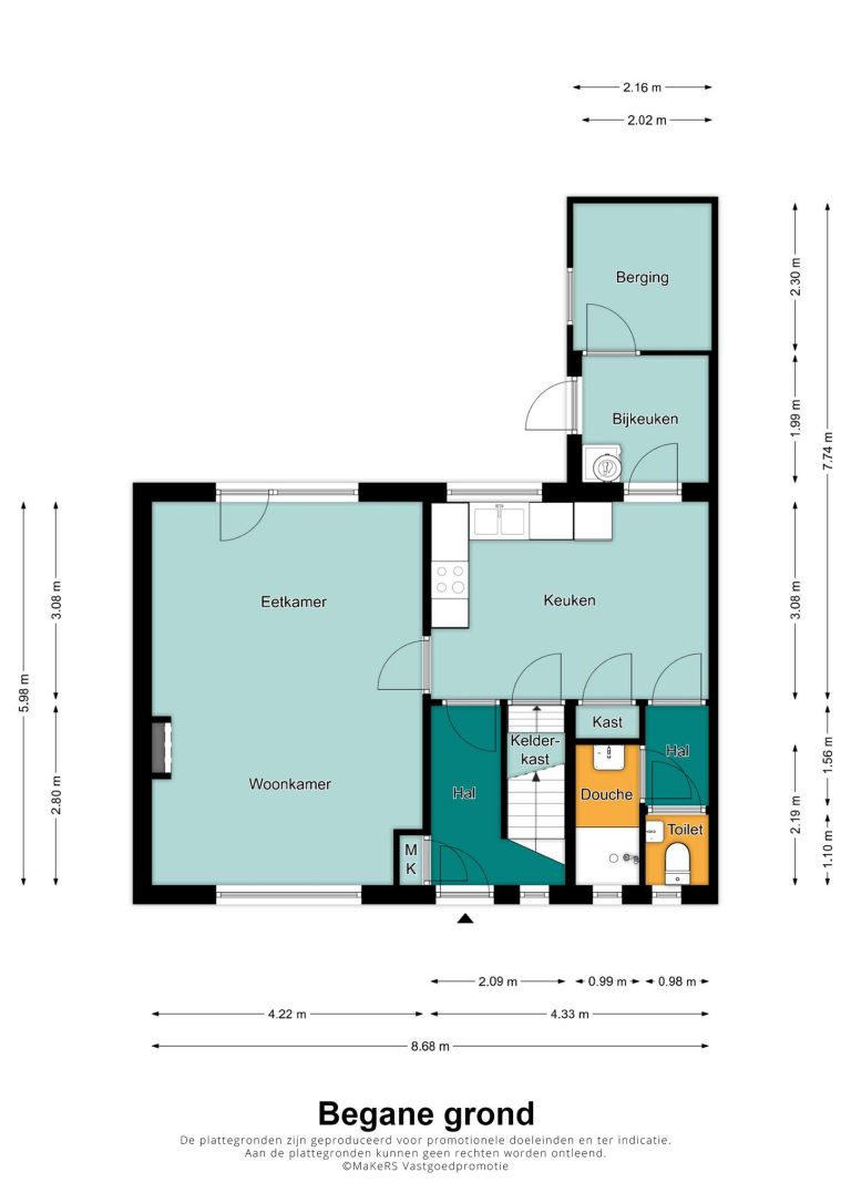 Vanuit de keuken zijn de trapkast, de muurkast en een portaal bereikbaar. Via dit portaal is de eenvoudige toiletruimte met toilet en fonteintje en de doucheruimte met douche en wastafel bereikbaar.