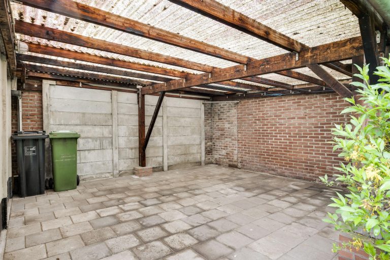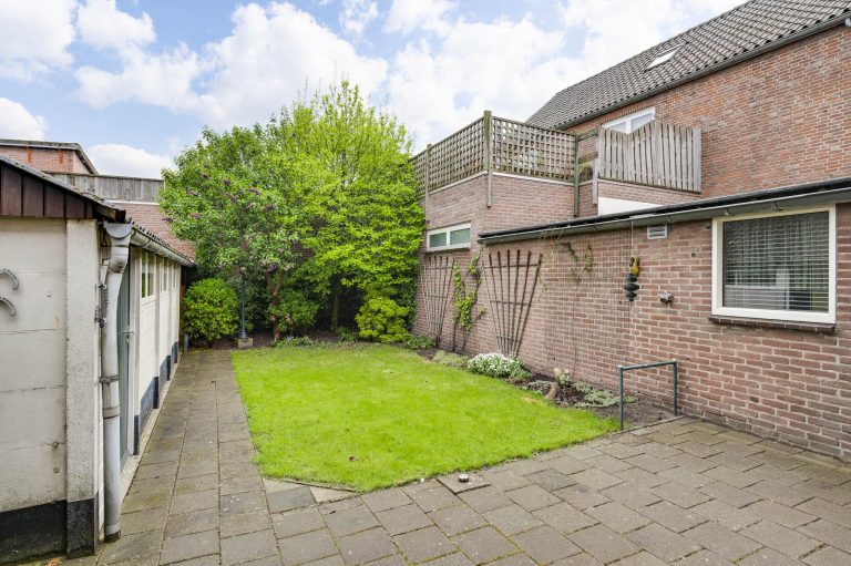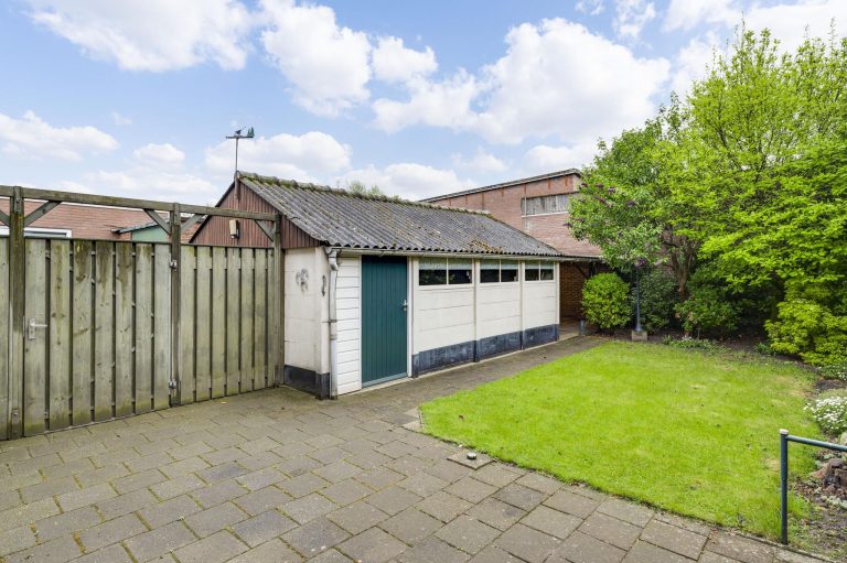 De omsloten achtertuin is gelegen op het noordwesten en is aangelegd met betegeld terras, gazon en diverse volwassen struiken. Naast de woning bevindt zich een royale betegelde oprit met schuur/garage van ca. 4 bij 6,30m voorzien van openslaande deuren. Achter de schuur bevindt zich nog een overkapping van ca. 4,7 bij 4,6 m.